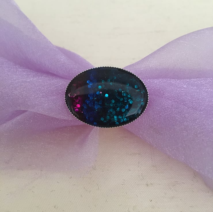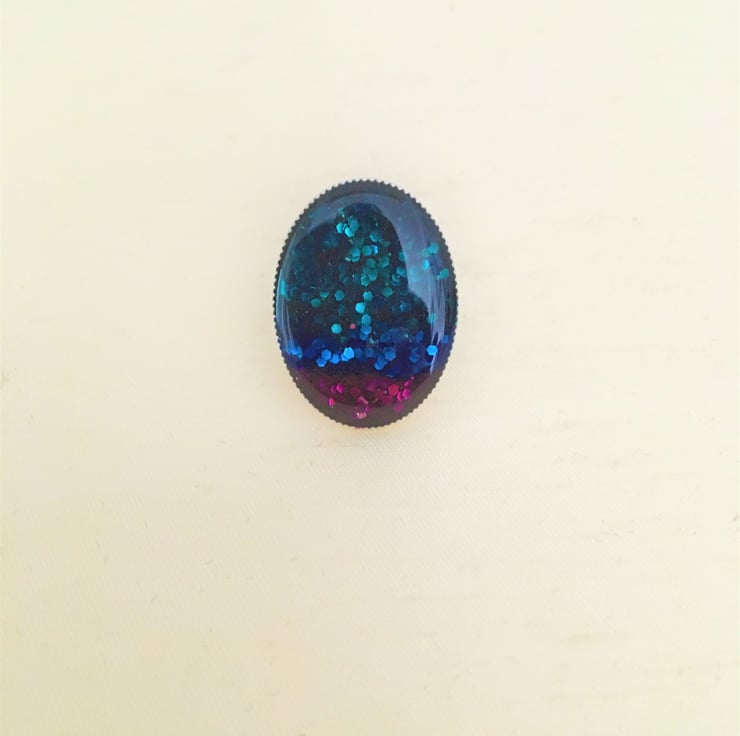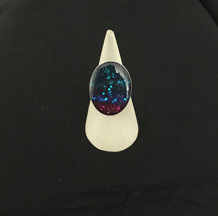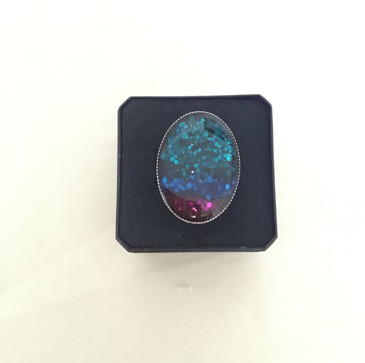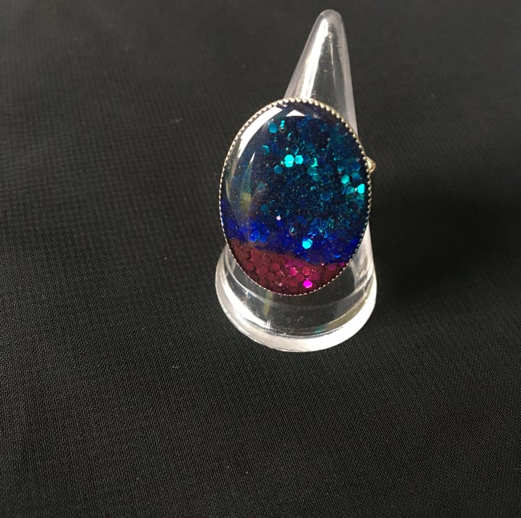 A striking ring using a tri-colour base with a 2 part resin mix overlay, the colours gently catch the light as the ring moves when worn.