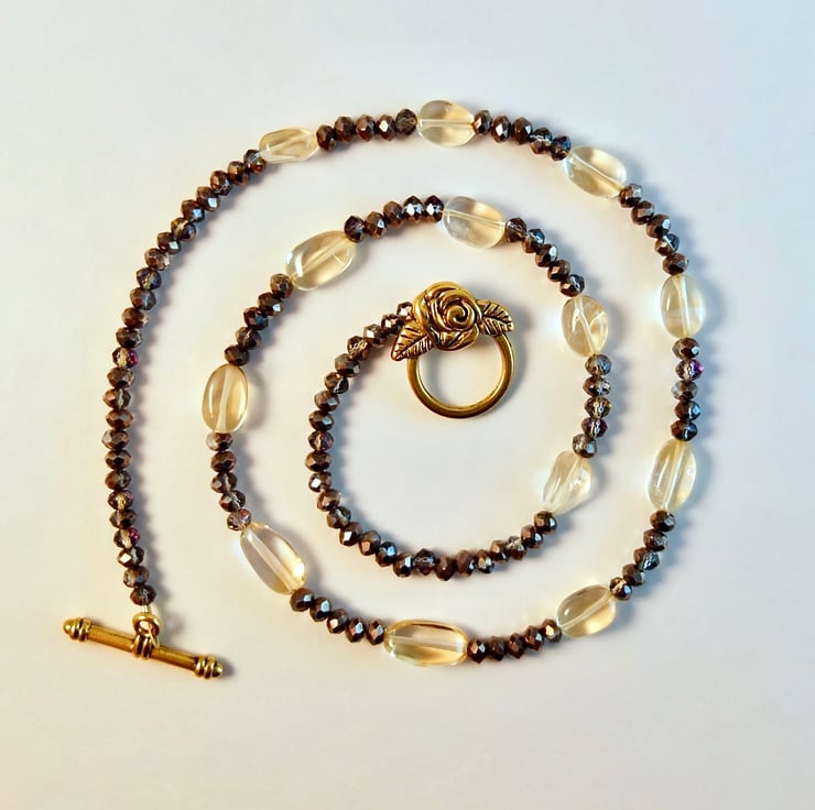 The glass beads are 3x2mm faceted rondelles with an electroplated coating that gives them a very sparkly, slightly metallic appearance.They are a neutral, mink-brown colour with flashes of purple and gold in the light.