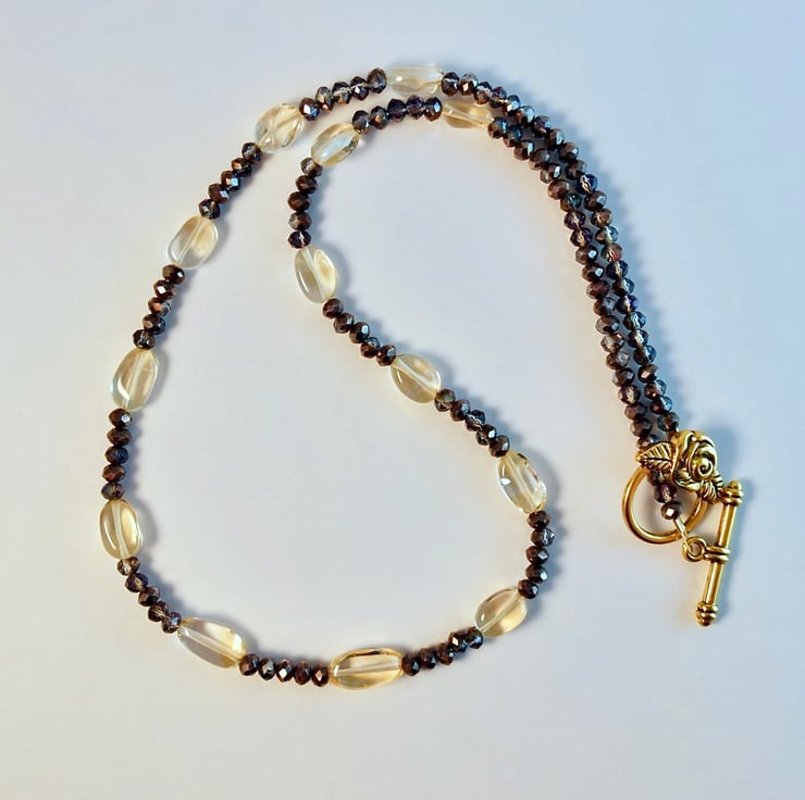This sparkly necklace features beautiful, genuine Citrine nuggets set between sparkly faceted glass beads.