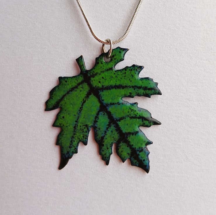 Large, leaf shaped pendant in green with ‘veins’ in black. The pendant has been kiln-fired and measures approximately 44mm from its stem to the tip of the middle leaf, and 40mm across its widest point when hanging. The back has been finished in tweedy green enamel. It comes complete with a soldered sterling silver jump ring and is supplied with an 18" silver plated snake chain and a little organza pouch.