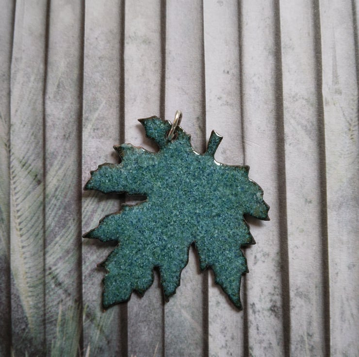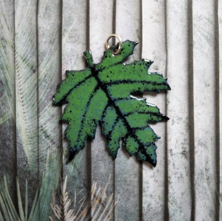 This large and elegant leaf has been enamelled in blue black and then overlaid with green enamel. Before popping it back in the kiln, I scraped away (sgraffito-d if we want to be correct) the veins to create a realistic-looking leaf which will not shrivel and crumble to dust but will give you years of faithful leafy service.