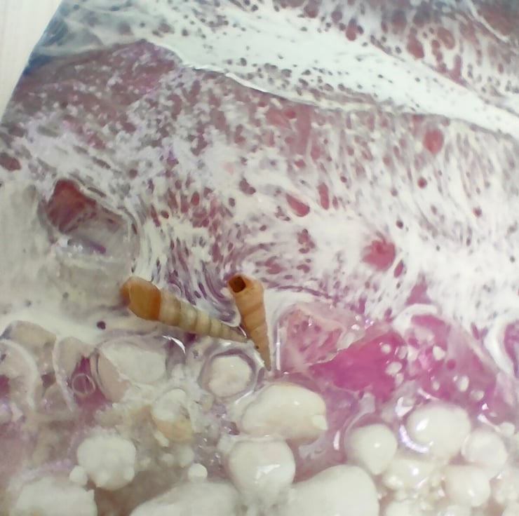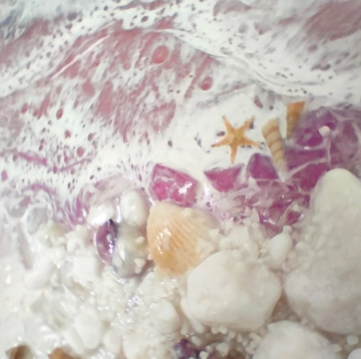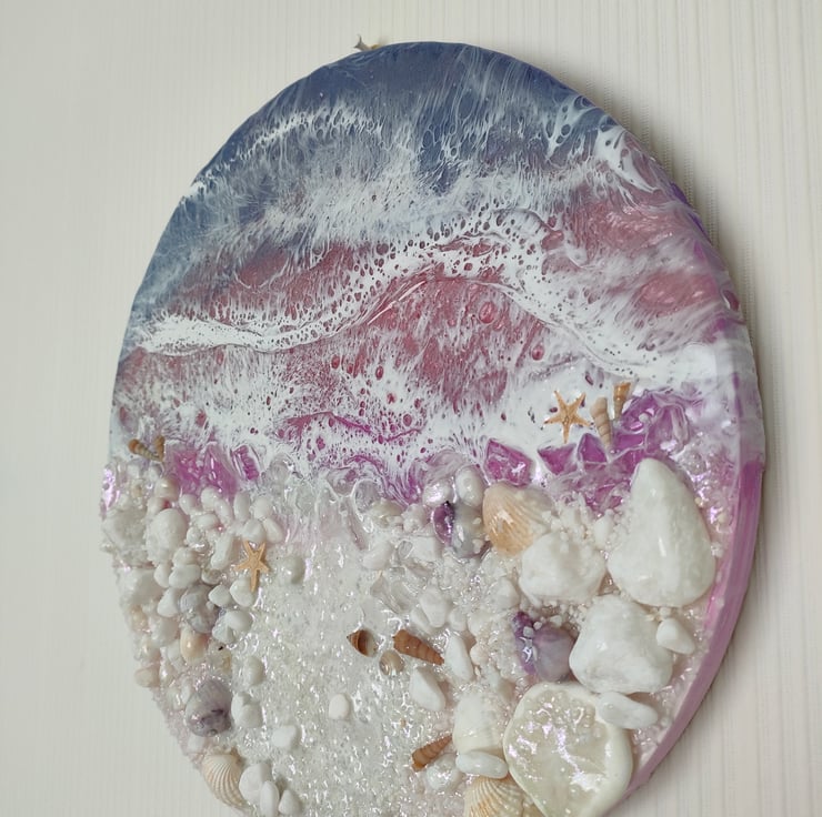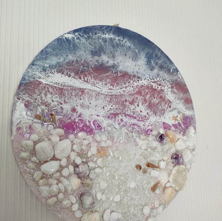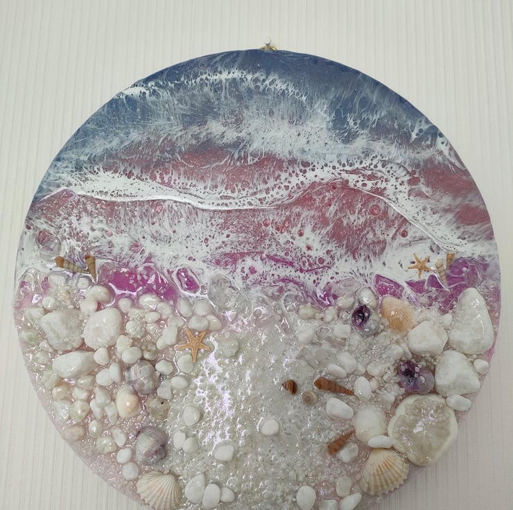 This textural piece is hugely tactile and is made with acrylic, ink, eco friendly resin, white sand, white pebbles and stones, shells, sand dollars, mini starfish and glass chunks.