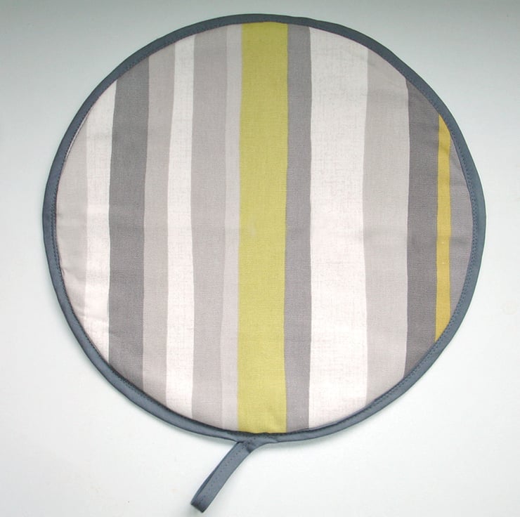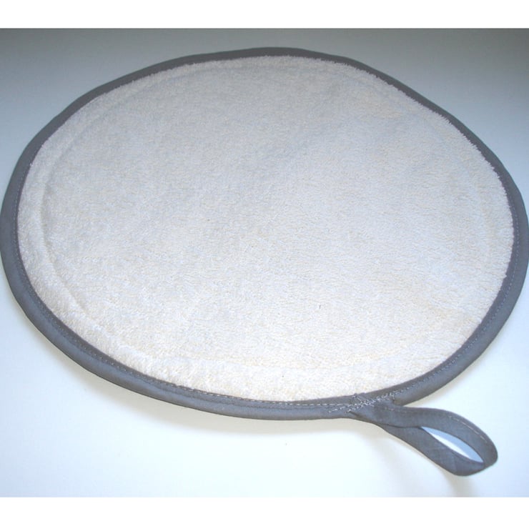 This mat has three layers - Facing cotton fabric, a layer of padding and a layer of towelling - Making it also suitable for mopping up and pot-grabbing!