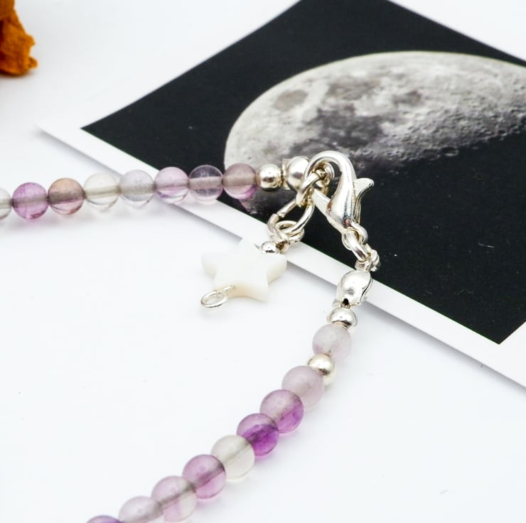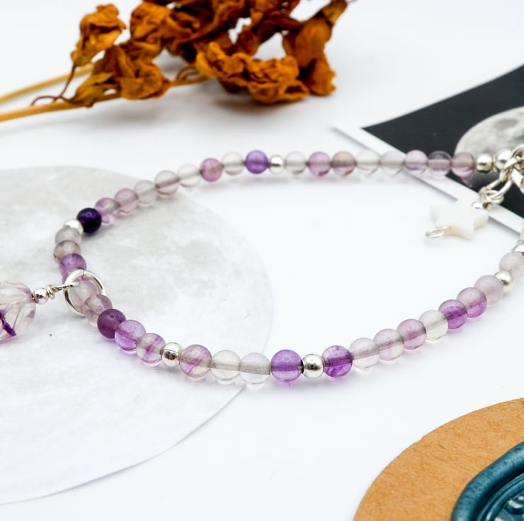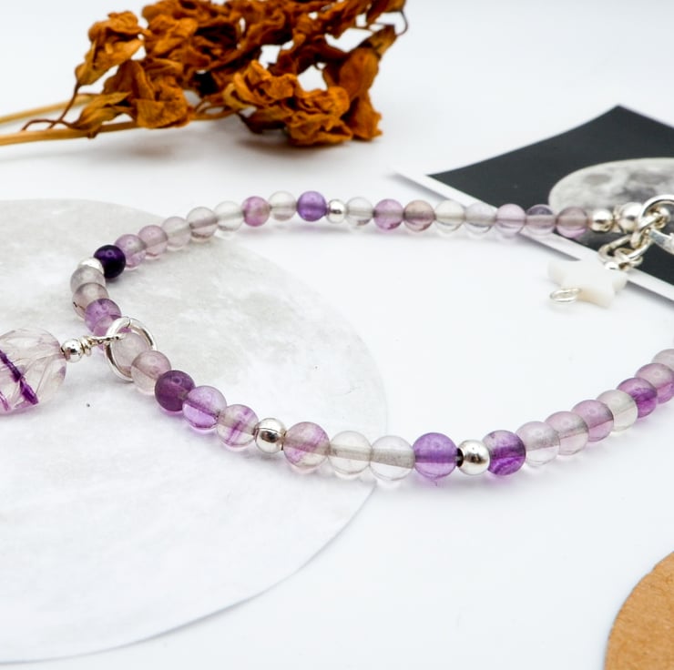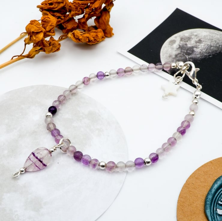 Our Cottagecore Sterling Silver Purple Fluorite Gemstone Beaded Leaf Bracelet, featuring a delightful mother of pearl star charm pendant, is a piece of jewellery that carries a hint of whimsy!
