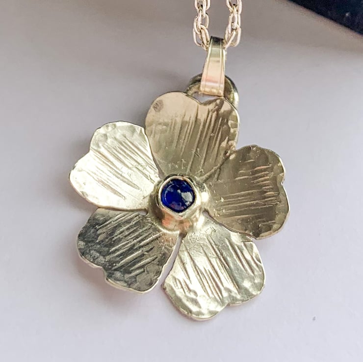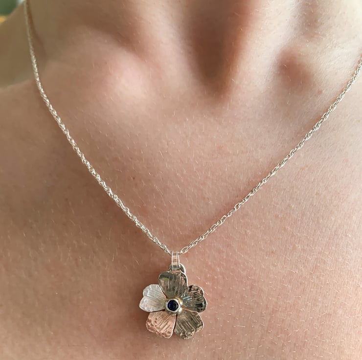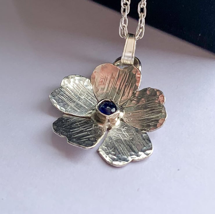 This one of a kind flower pendant necklace has been cut from 100% recycled sterling silver sheet and formed and textured using traditional silver smith techniques. A blue sapphire accents the centre of the flower. This beautiful piece was inspired by wild flowers growing on a hill path when out walking in my local area.