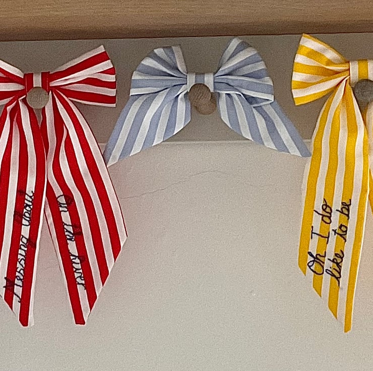 These delightful vibrant, striped hair bows feature custom words and phrases making them a truly unique gift and beautiful addition to any outfit. They are ideal for weddings with bride and groom initials and date, first day of term - worn every September for photos or first beach holidays etc. They come with a choice of backings - hair elastic, crocodile clip or brooch backing making them versatile. They can be worn, hung on garlands or peg rails as room decor or pinned to bags etc. They are made from 100% cotton and measure approx 14 cm wide and 24cm long. Please state colour of bow, wording and colour of hand embroidered text. I can check your requirements before beginning stitching. Please feel free to contact me with any questions before you purchase. Please see my website www.hollydrivedesigns.com for more options