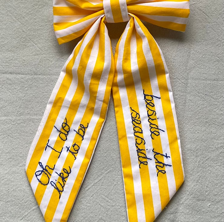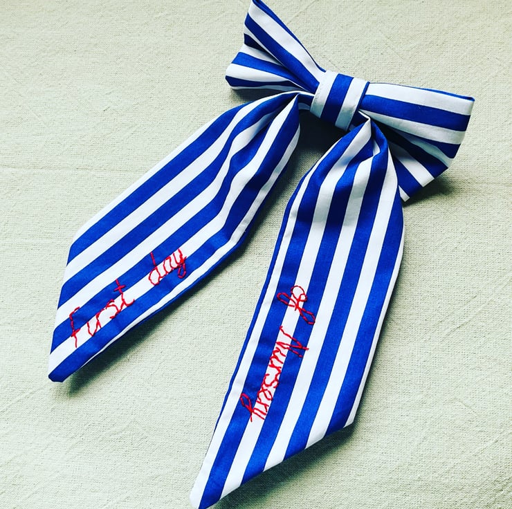 inspired by the Summer and seaside holidays I made these large, beautiful bows to clip onto my straw bag, I then made the blue ‘First day Of Nursery’ bow as a hair slide for a friend. I enjoy making bespoke orders and sewing customers orders making unique and personal gifts. My current time for custom orders is 7 days but if you are in a hurry please email and I will let you know if I can make an express order for you,