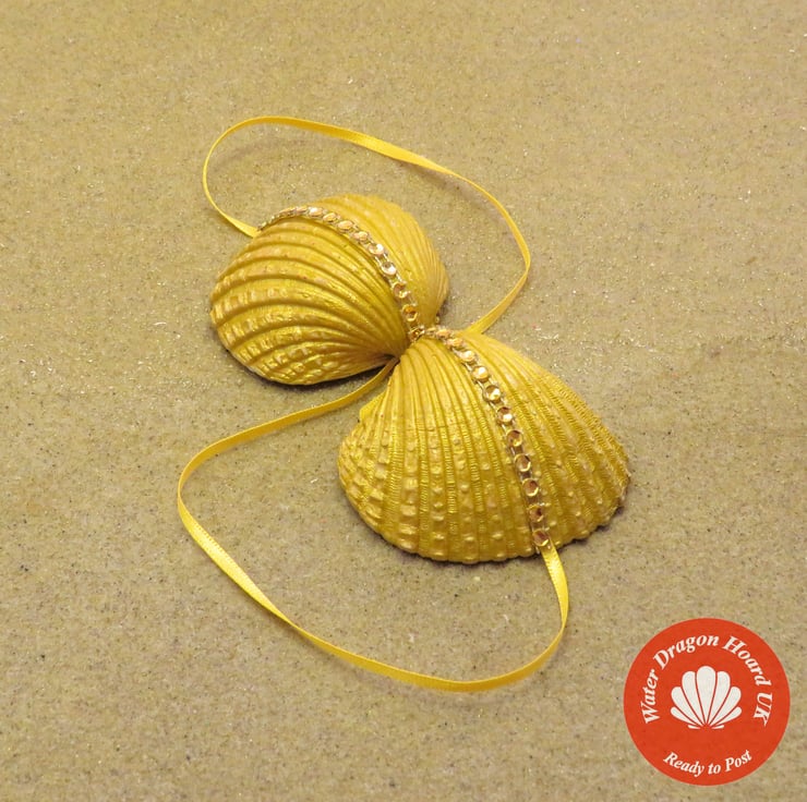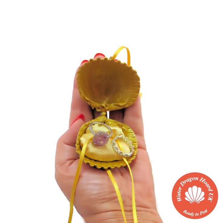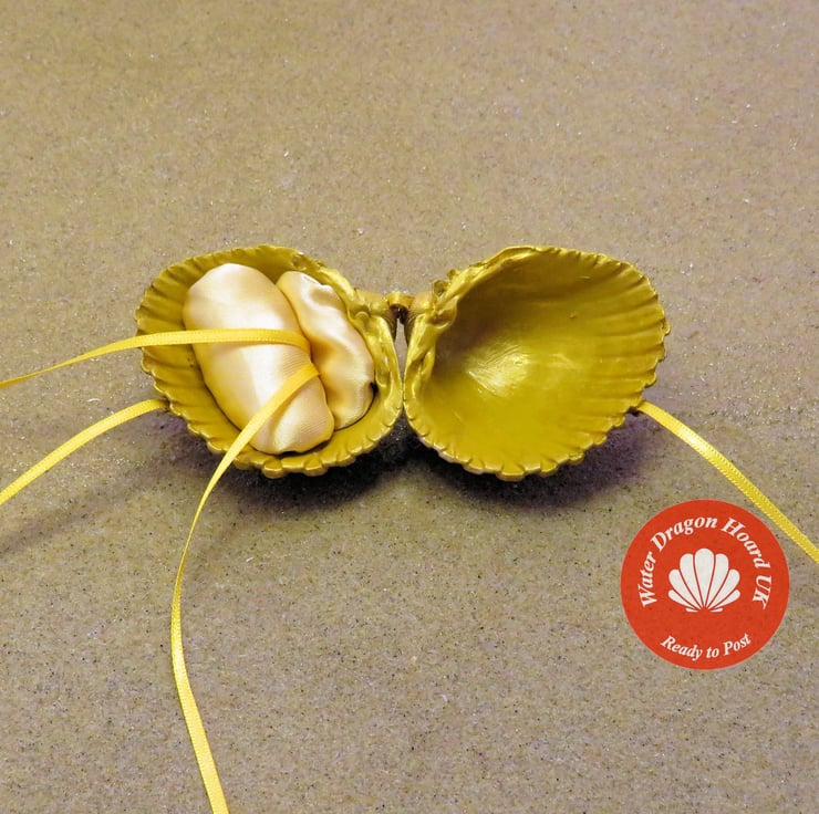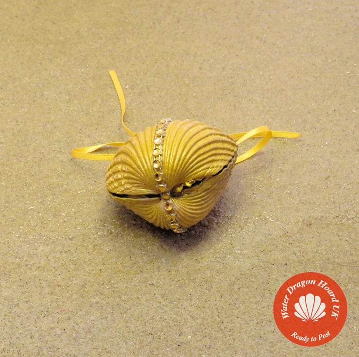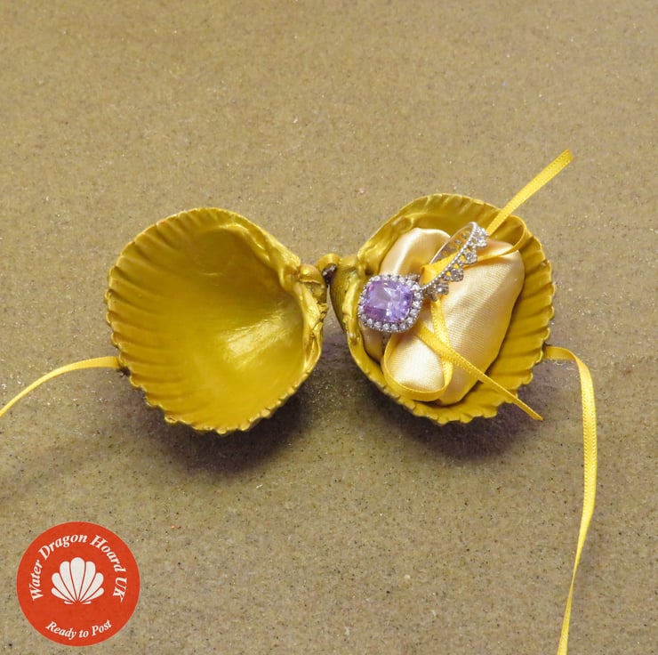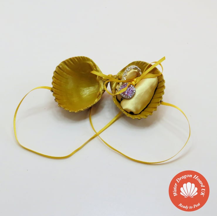 This beautiful and elegant naturally hinged cockle shell can hold two rings, has been painted with gold acrylic paint, varnished, and adorned with golden diamante braid.