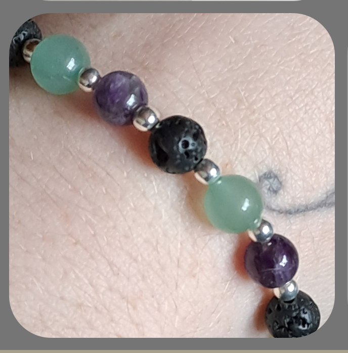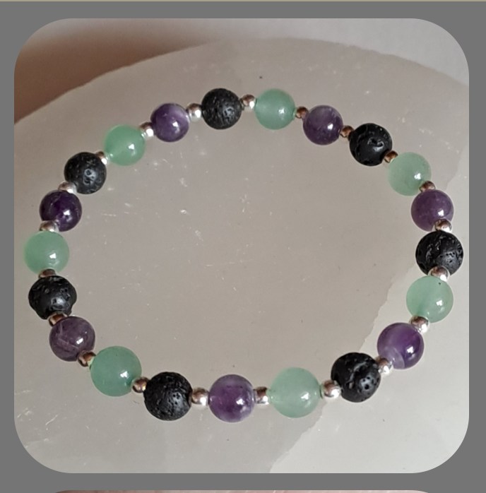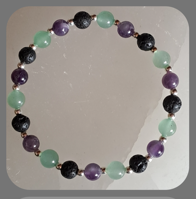 Aromatherapy bracelet with Amethyst, Aventurine, Lava Stone and Sterling Silver. Lava Stone is a porous stone and can be used for aromatherapy. Just put a drop of your favourite essential oil on it and enjoy the aroma.