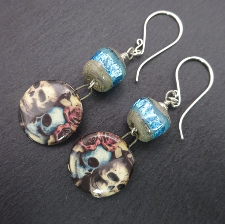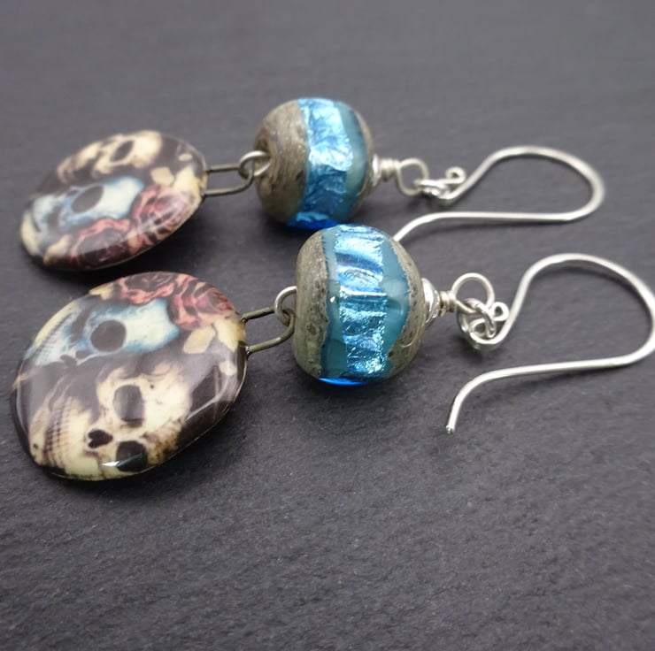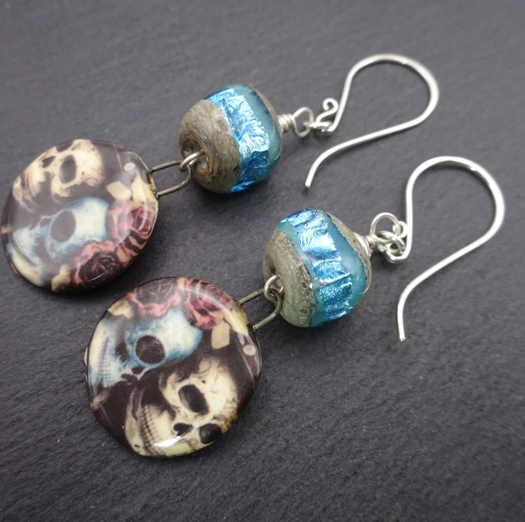 A pair of earrings made with handmade sterling silver ear wires, handmade lampwork glass beads and handmade ceramic skull charms.