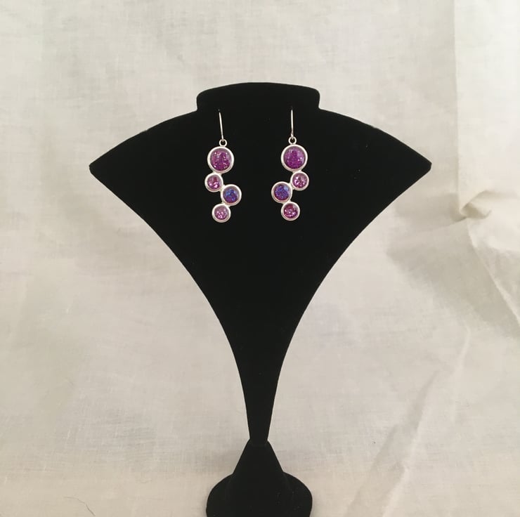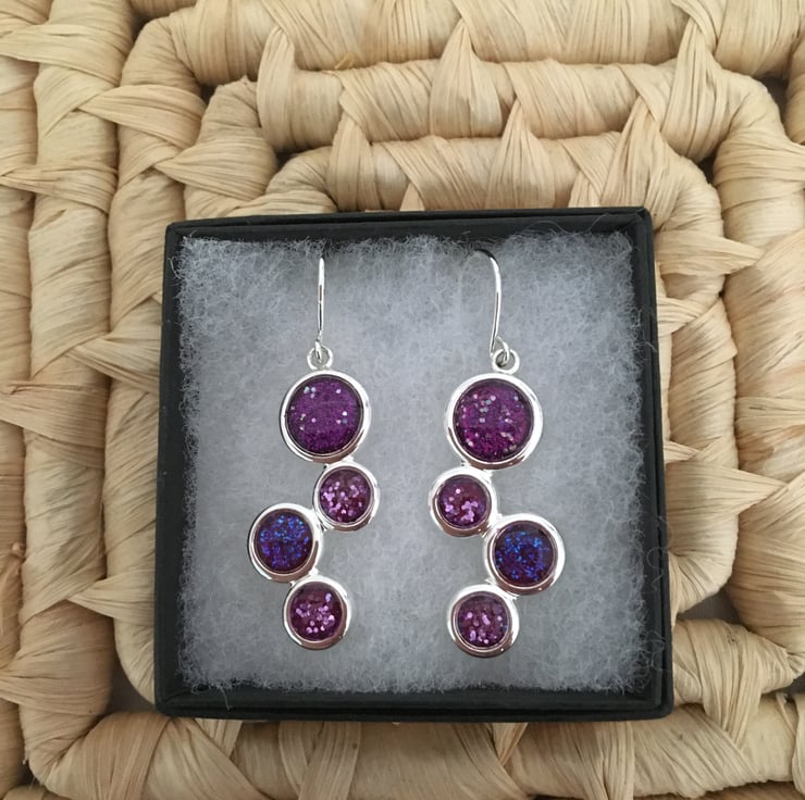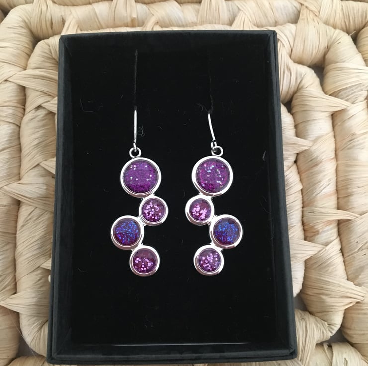 These are handcrafted earrings in 2 shades of colour overlaid with a 2 part resin, they have a glint of a shimmer all set in a silver tone setting.