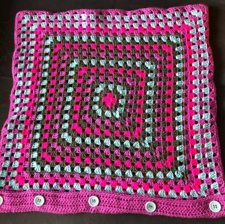 This listing measures 17” x 17” washable at 30 degrees. It has a button fastening.
