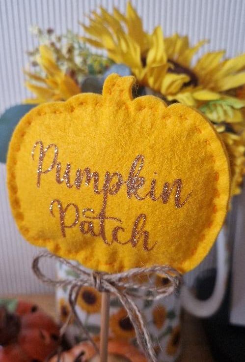 A pumpkin shape cut from woolfelt in colour 'Gold'' with a gold shimmer vinyl decal saying 'Pumpkin patch'.