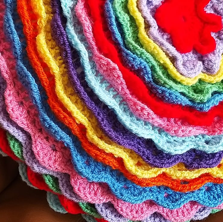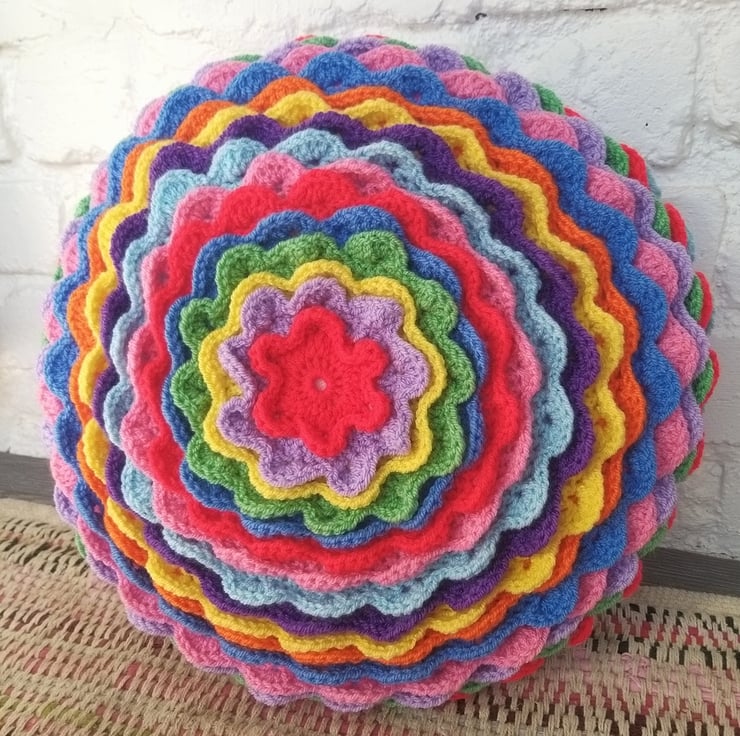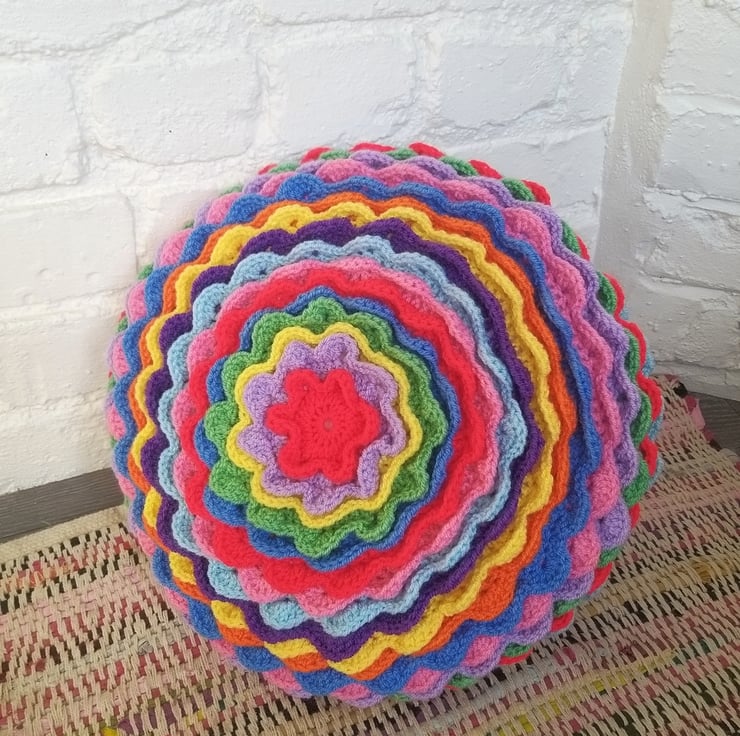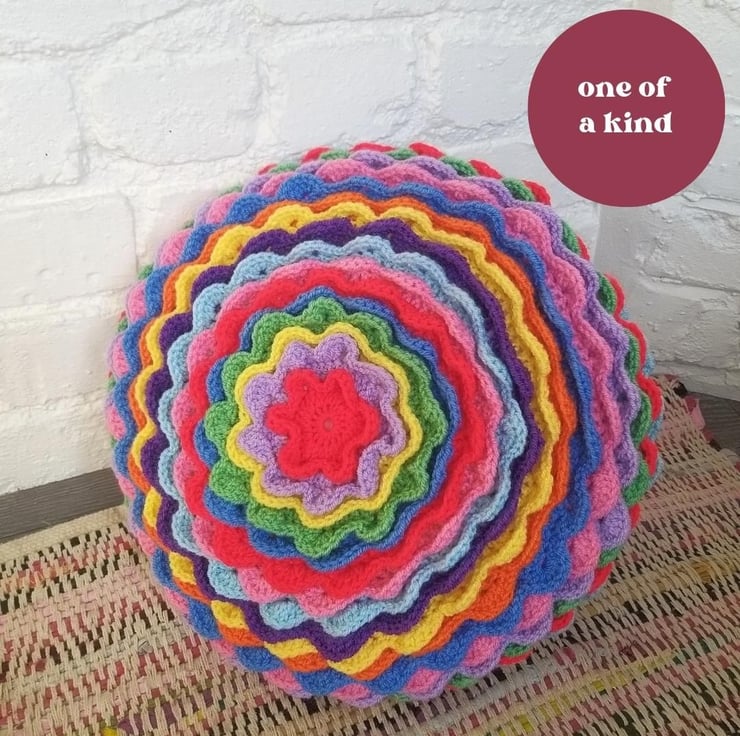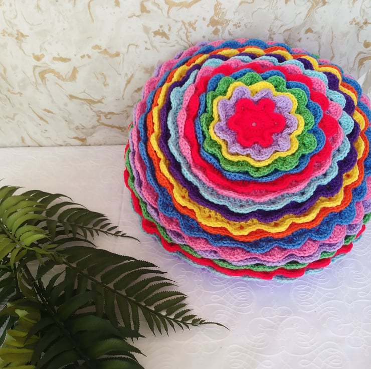 This crochet cushion is made in the style of a water lily. It has ruffled almost 3D petals making it wonderfully tactile. Made in bright, happy colours including Lipstick Red, Daffodil Yellow, Cornish Blue and Barbie Pink it'ss perfect for brightening up your sofa or favourite chair. It has a co-ordinating plain Lilac back.