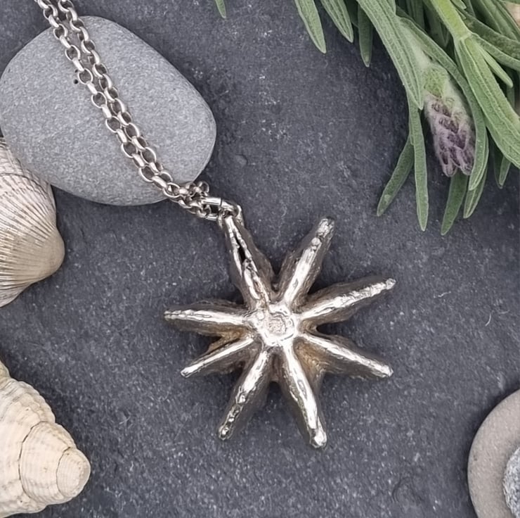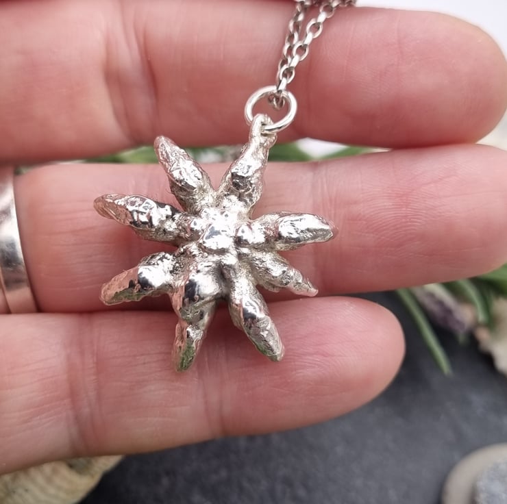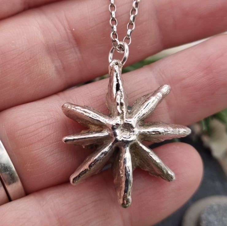 This star anise measures approximately 3cm high and is supplied on a sterling silver chain. You can choose from 16", 18" or 20" lengths and from belcher, curb or snake chains styles. Please see the photo showing what each type looks like, snake on the left, curb in the middle, belcher on the right. Please just include a message with your order with what type you would like, otherwise an 18" belcher will be sent as standard. Longer lengths available but may incur additional cost, please message with details of what you would like and I will sort out a quote for you.