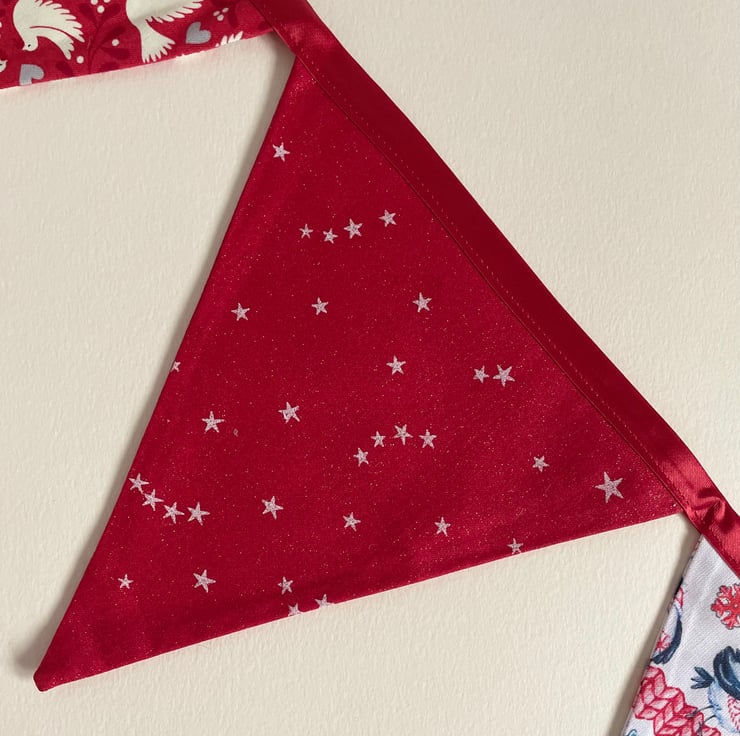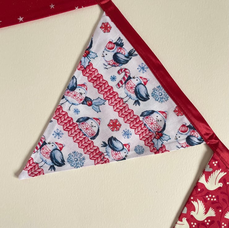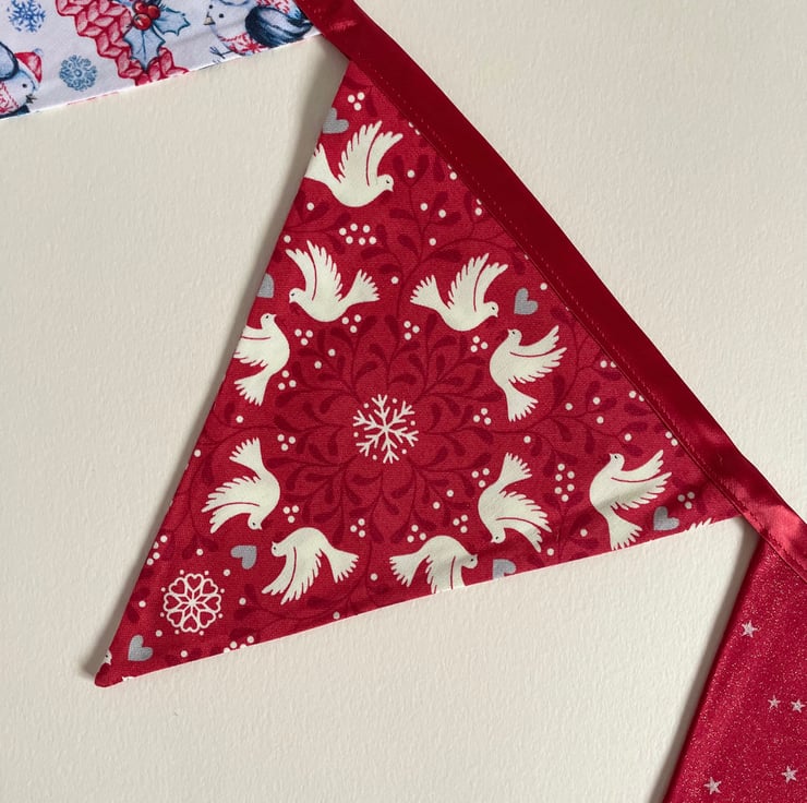 Large bunting with very cute robins. The white doves glow in the dark. 229 cm long from one side to another. 9 double sided panels. Reusable and washable.