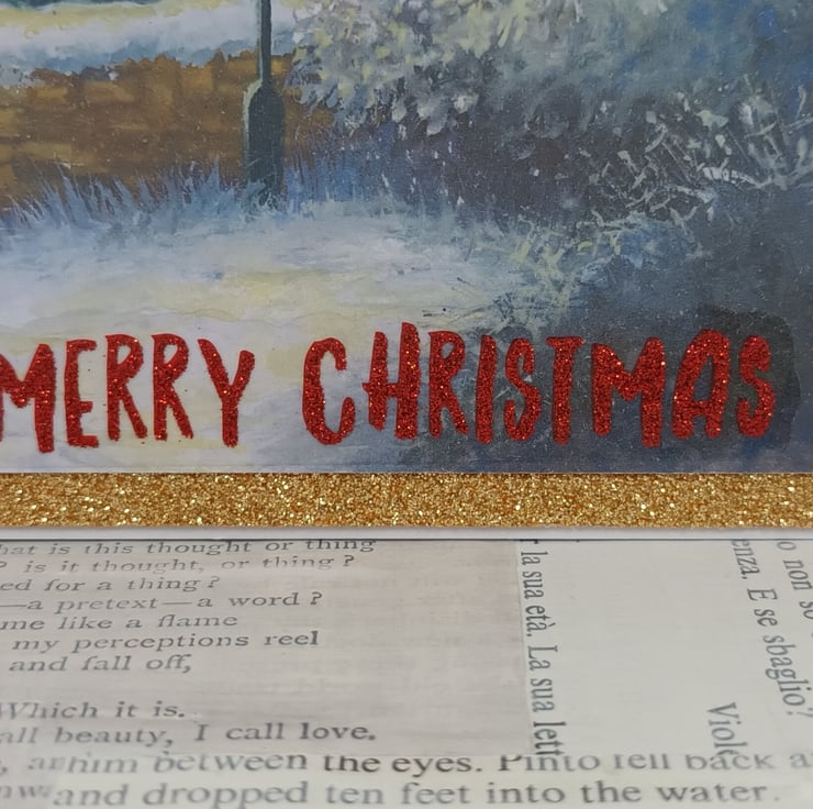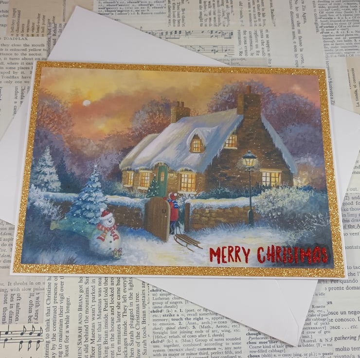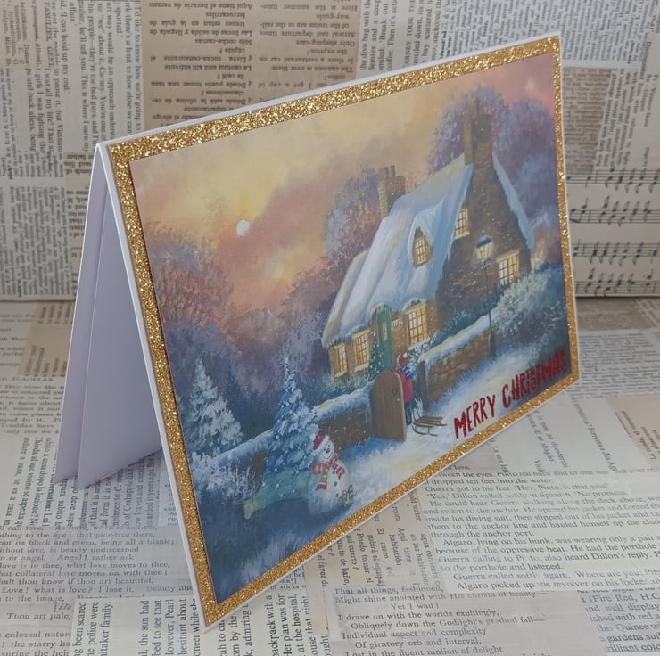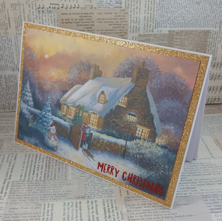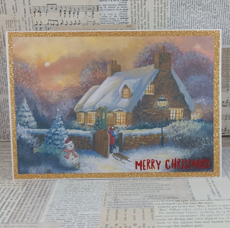 A5, landscape Christmas card featuring a snowy scene with a thatched cottage and a cute snowman. The image has been mounted on gold glittered card and a glittered sentiment reading 'Merry Christmas' has been added to the bottom corner.
