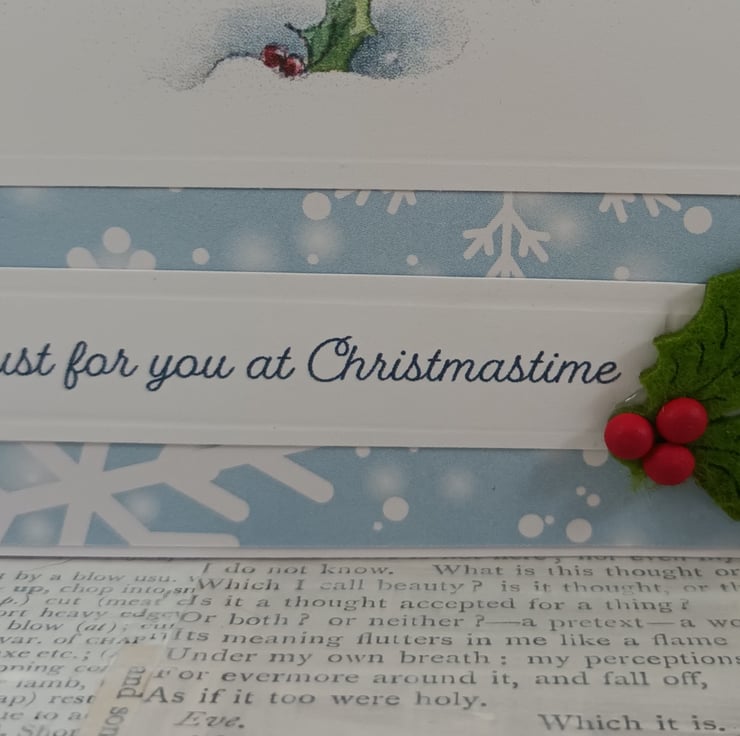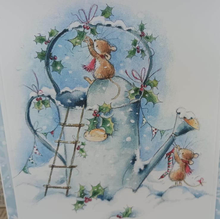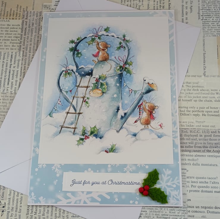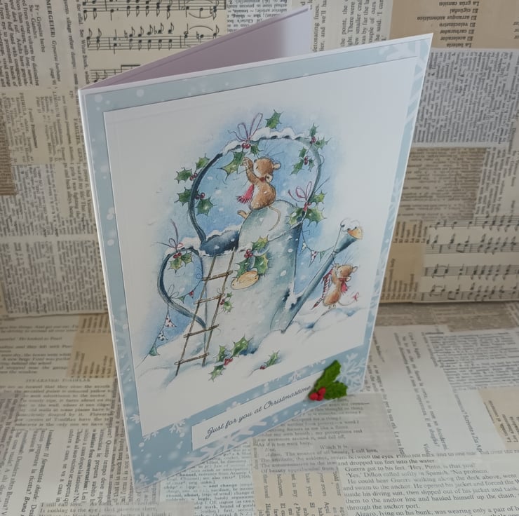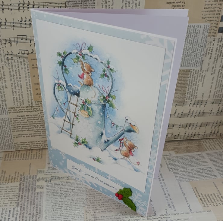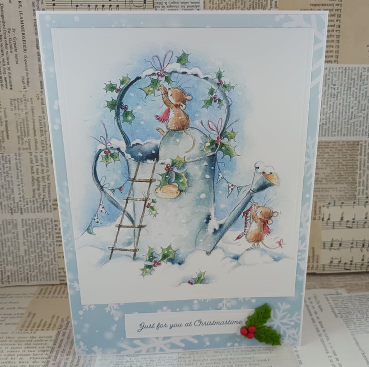A5 Christmas card featuring a cute printed image of two mice decorating a watering can with holly and bunting. The image has been overlaid on to pale blue snowflake patterned paper. The sentiment reads: 'Just for you at Christmastime' and is embellished with small felt holly leaves.