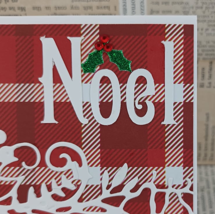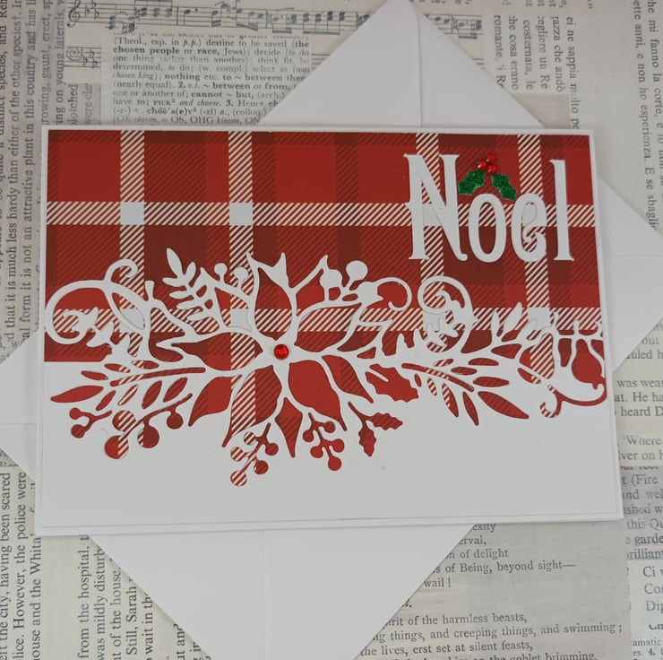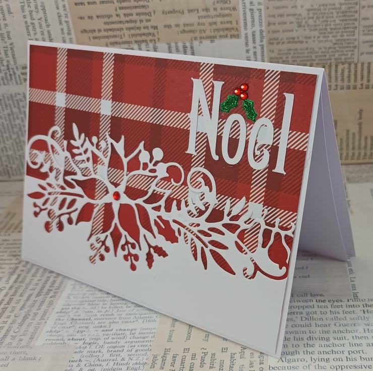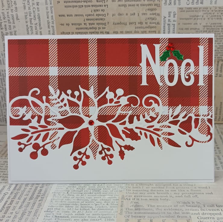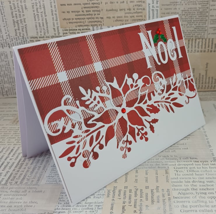 Pack of 3 A6 sized, landscape cards. Each card features a poinsettia flourish, die cut from white card and overlaid onto a red and white tartan background. The sentiment is 'Noel' and has a small glittered holly embellishment added.