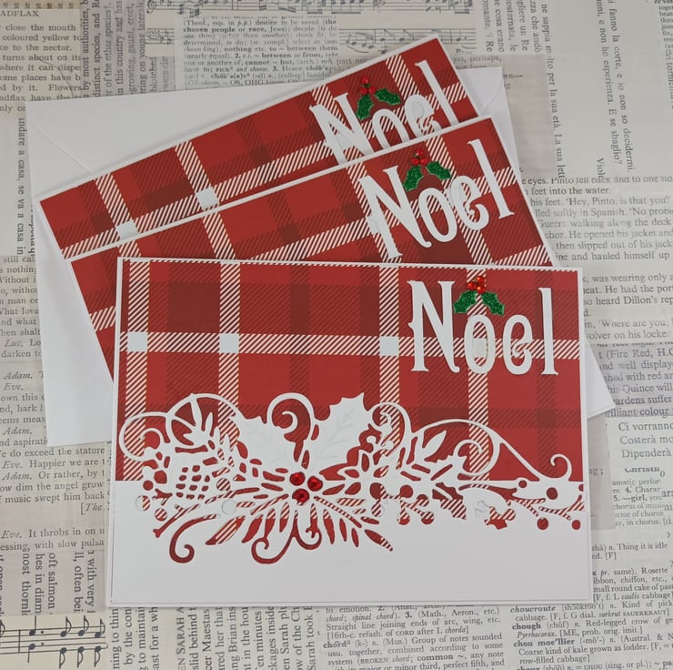 Pack of 3 A6 sized, landscape cards. Each card features a holly flourish, die cut from white card and overlaid onto a red and white tartan background. The sentiment is 'Noel' and has a small glittered holly embellishment added.