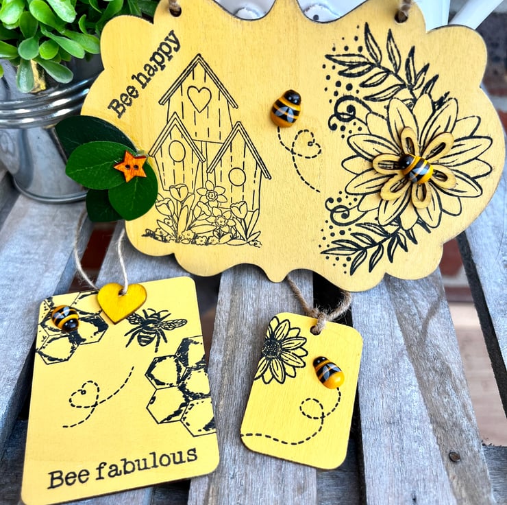'Bee Happy Wooden Decorations' is a set of three items. The largest is 15x10cm, the middle size one is 8x6cm and the smallest one is 5x3.5cm. All sizes are approximate.
