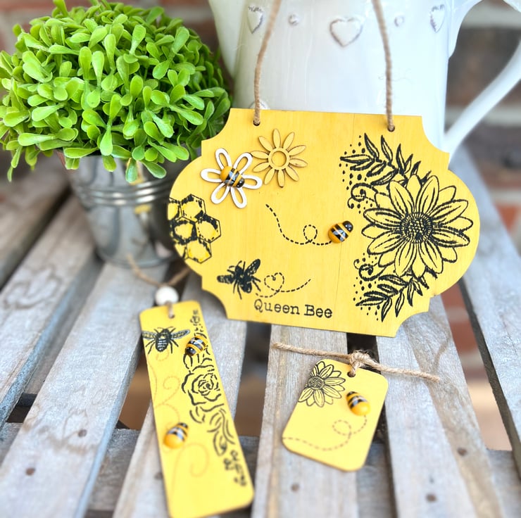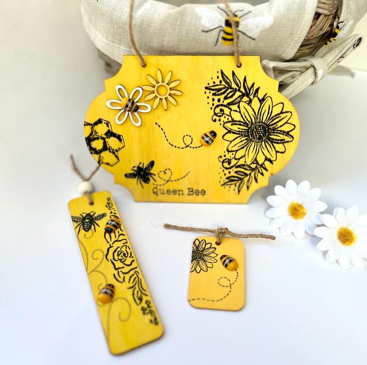 These make a lovely gift or home decoration for any bee fan. The smallest wooden decoration is perfect to use as a gift tag first, before it can become a keepsake and decoration around the home. The middle size one can be used for a bookmark or decoration too.