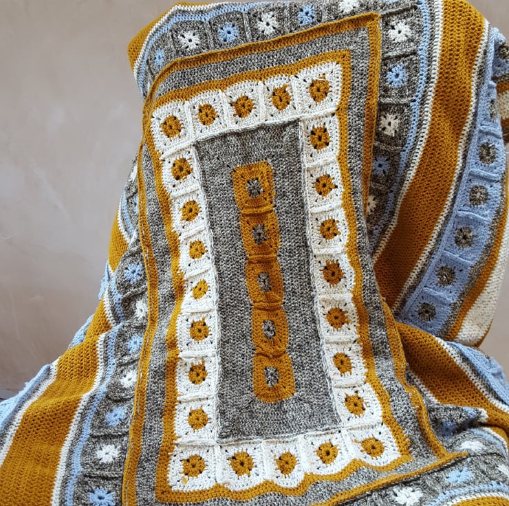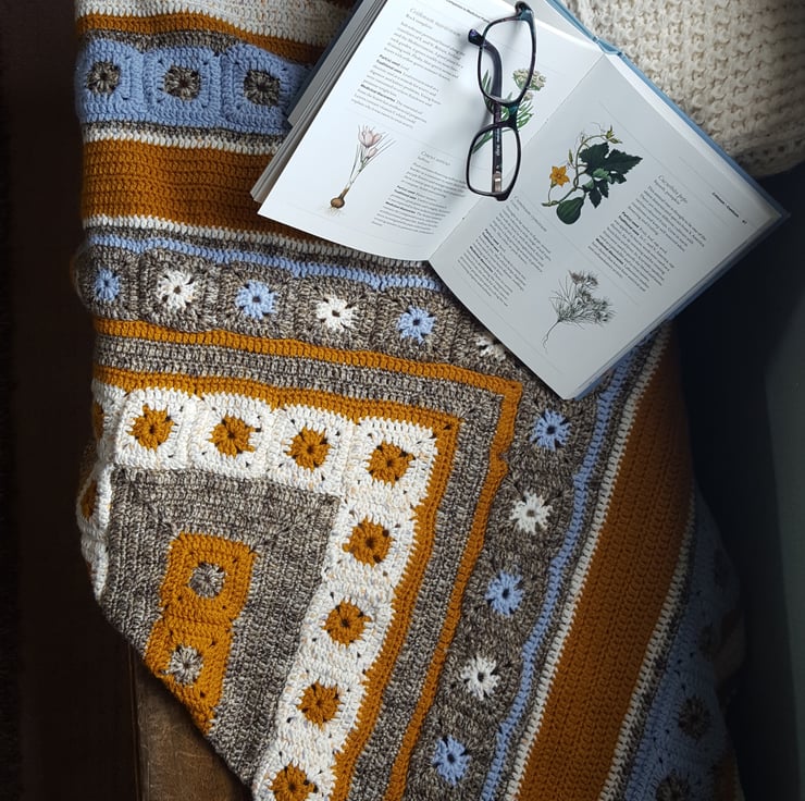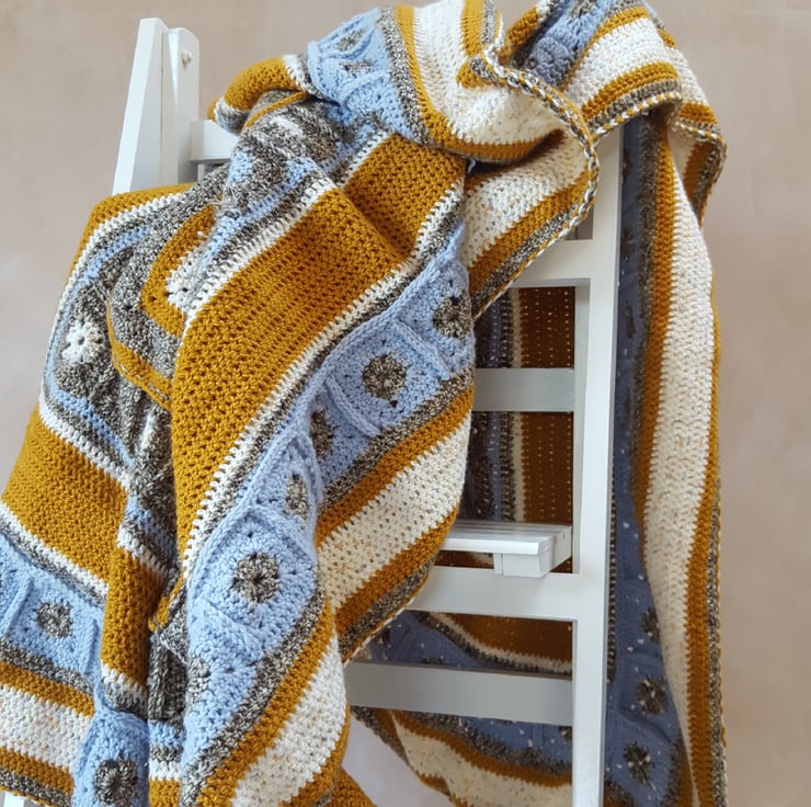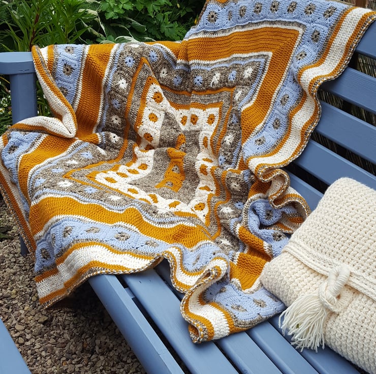 The colours for this throw were inspired by a winter storm over the Yorkshire Wolds. The sky was grey with blue in the distance and the sun was peeping through storm clouds a golden yellow. Of course you can make this throw in any colours to suit you!