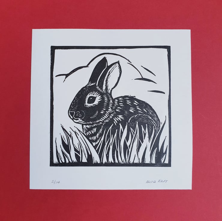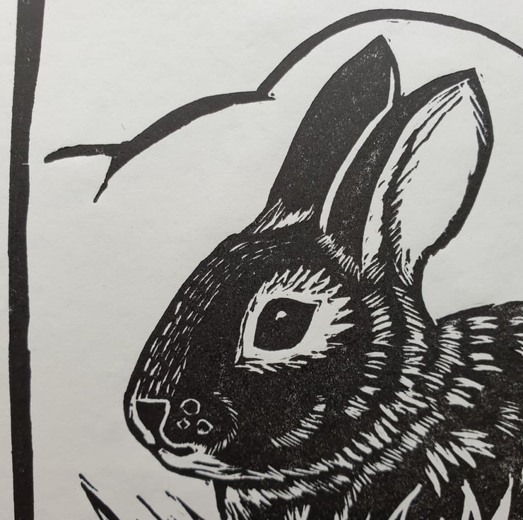 Black and white linocut illustration of a baby bunny sitting in the grass.