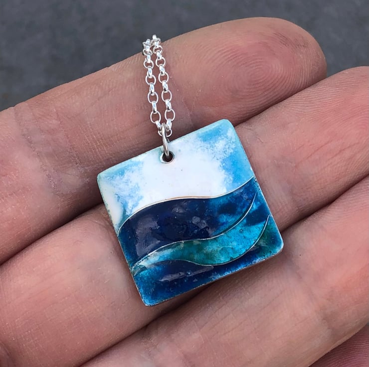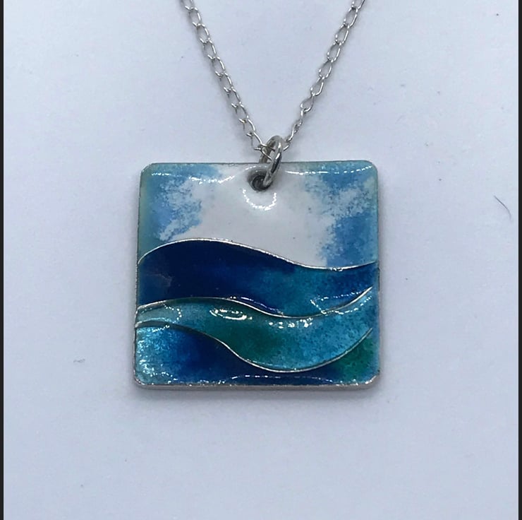This Enamel Pendant is made from Sterling Silver with enamel and fine silver detail. The wave design was inspired by the seaside at Brighton. The silver backed pendant measures approximately: 2cm by 2cm and hangs on an 18” Sterling Silver chain.