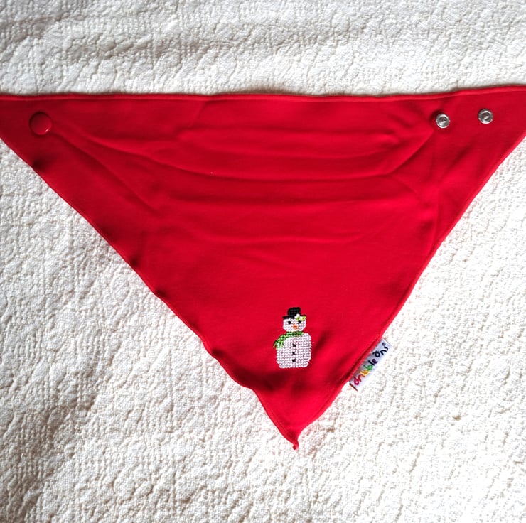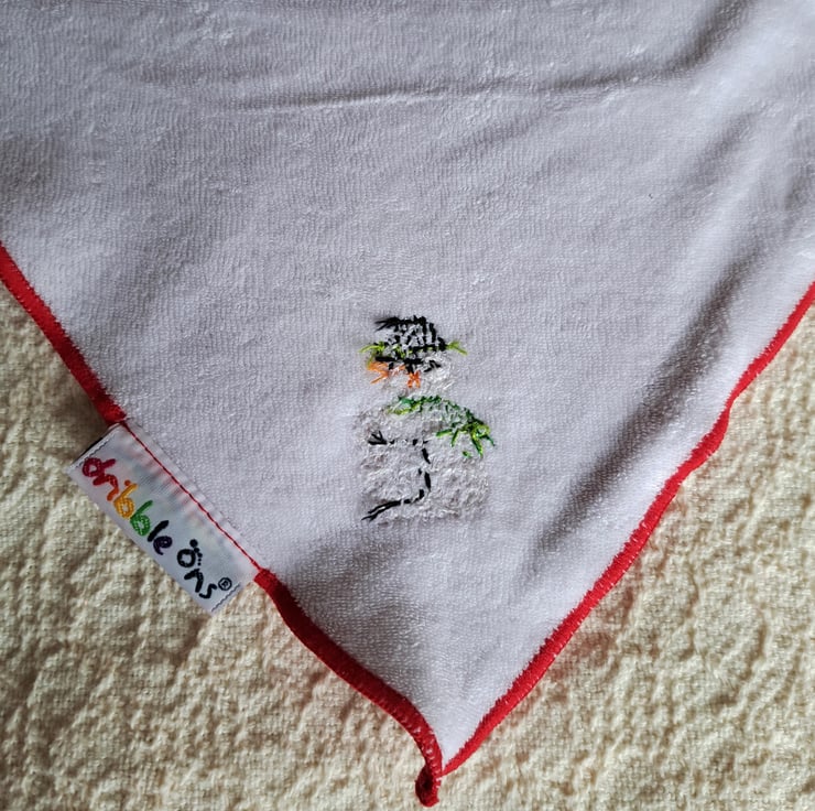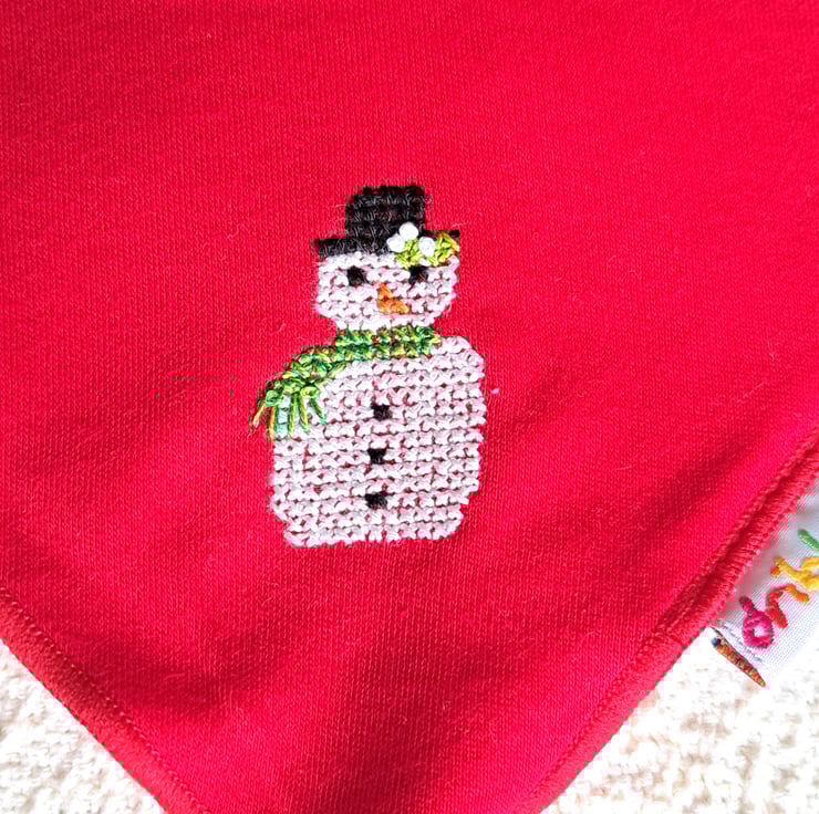 I have hand embroidered a snowman on the bottom corner of a gorgeous scarlet bib by dribble ons. The snowman wears a black bowler hat with a sprig of mistletoe on the brim and a fringed green scarf. He has the traditional orange carrot for a nose and coal for his eyes and buttons. The bib fastens at the back of the neck with either of two press studs. The front is all cotton and the back is white polyester cotton towelling. It is machine washable.