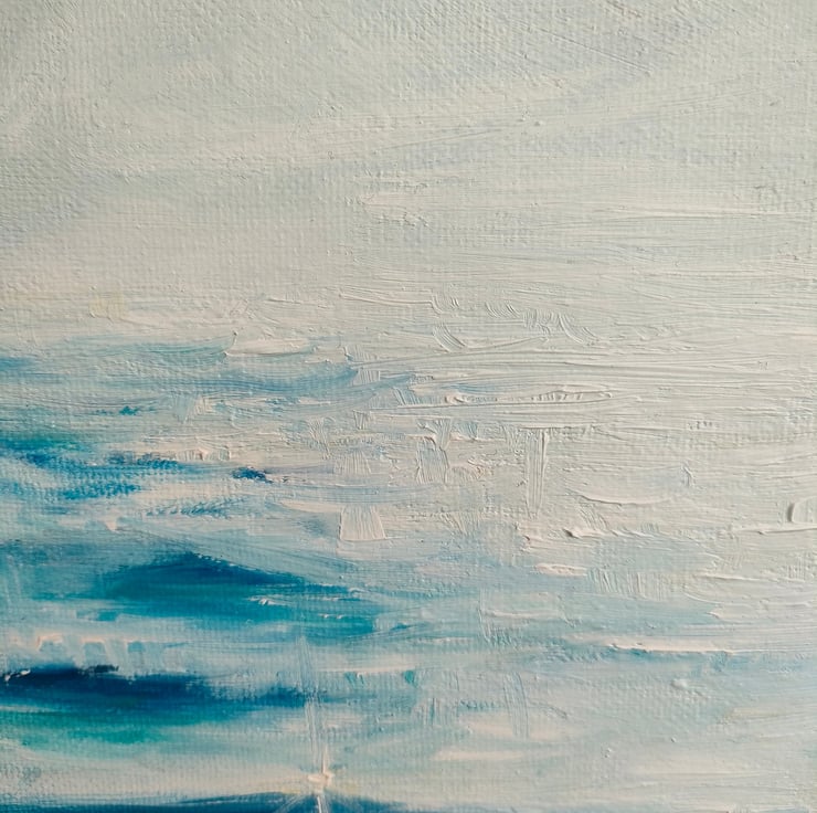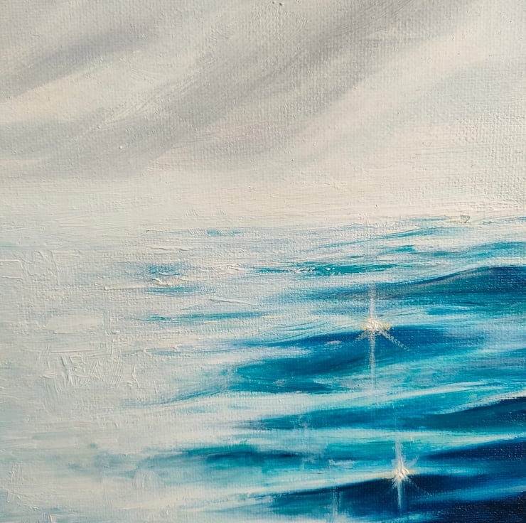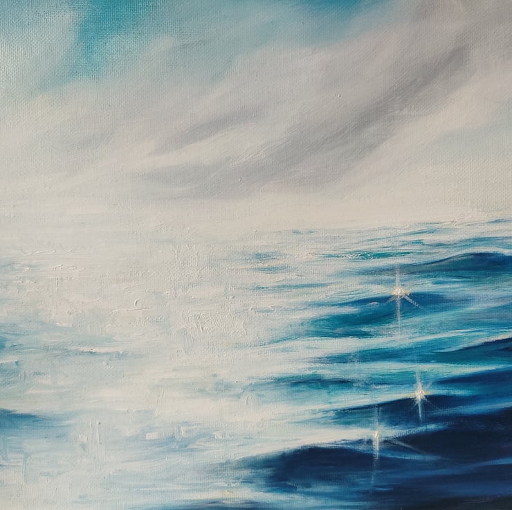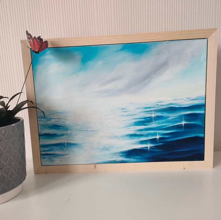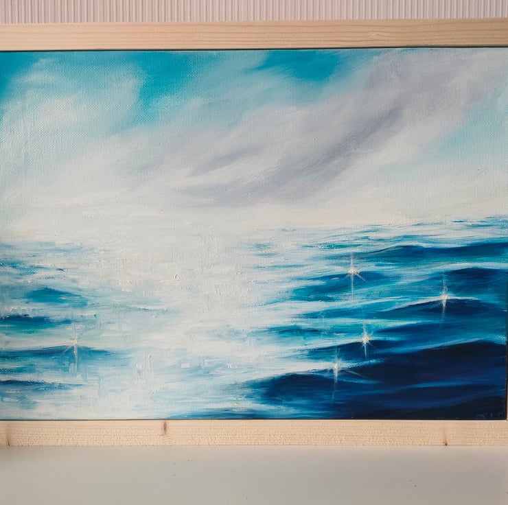 Framed oil painting on a deep canvas, 39.5cm x 29cm. The frame is 4.5cm deep. This is the smaller painting, so far, in my water series and the only one based entirely on a past memory. Glistening Sea is that moment when you gaze out at sea, experiencing the bright, glistening light of the sun's reflection on the ocean.