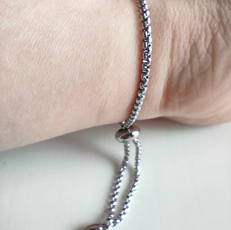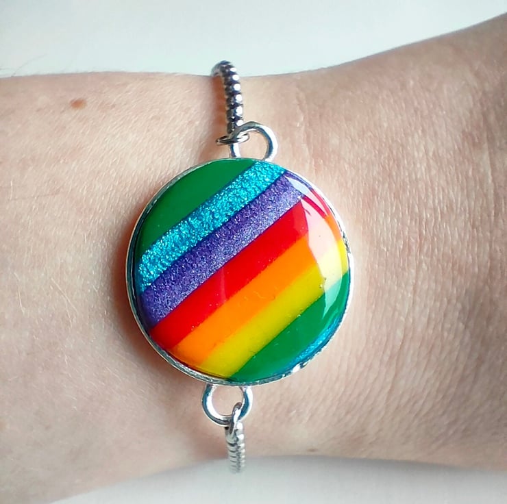 This bracelet fits wrists up to 8.5 inches. It features a polymer clay rainbow striped design set within a silver coloured bezel. It has a top coat of resin for durability, smoothness and shine.