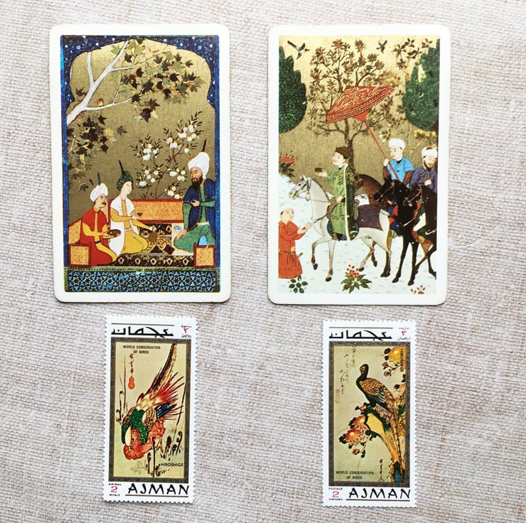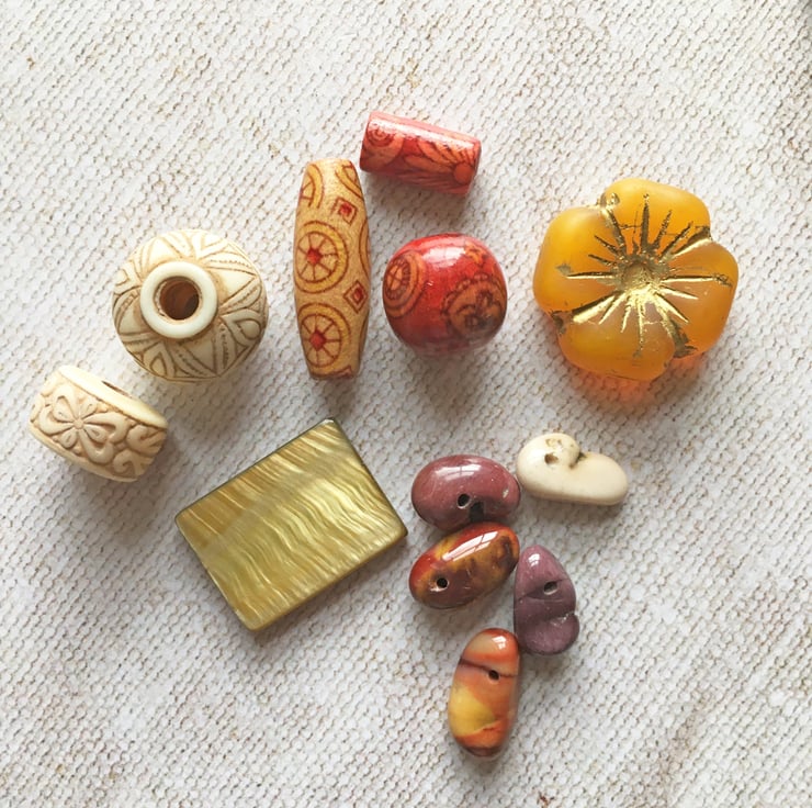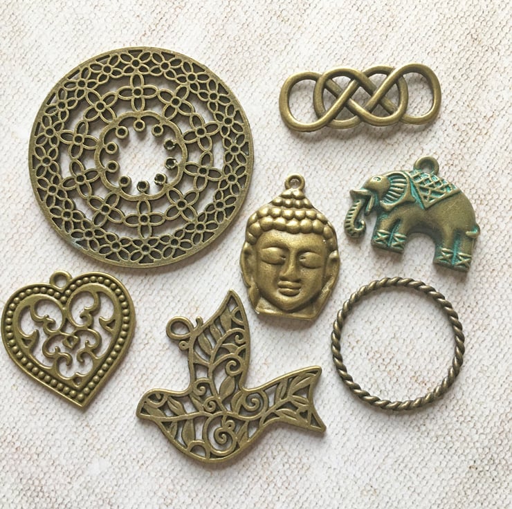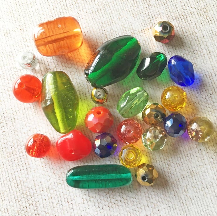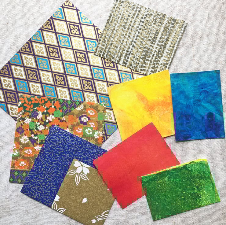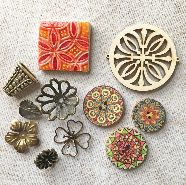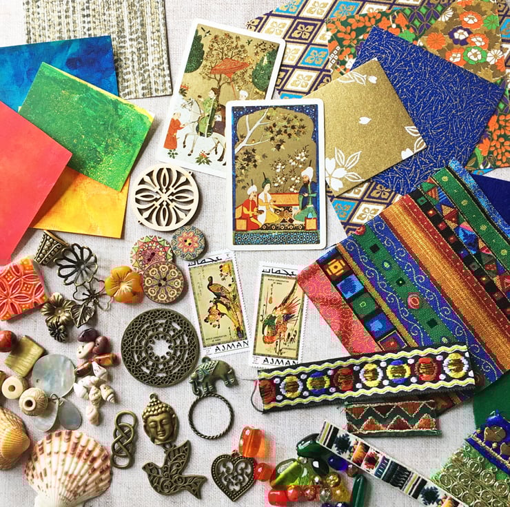 I've raided my supplies and put together a colourful, bargain bundle of items including a selection of papers (painted and origami), vintage playing cards, postage stamps, charms, beads, shells, buttons, bead caps, fabric, stiff felt, trims and more.