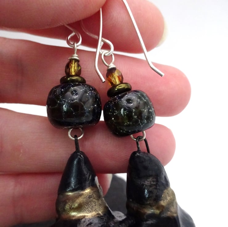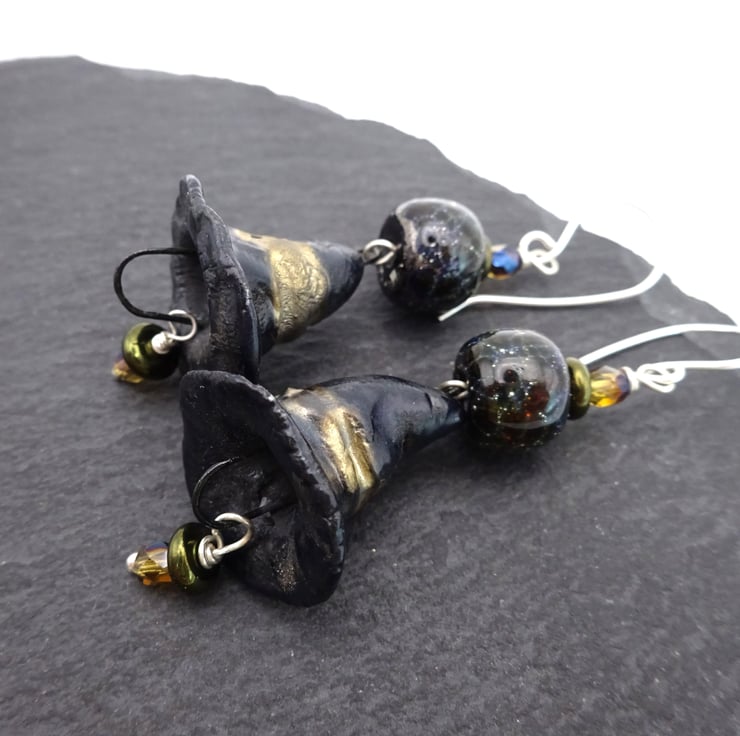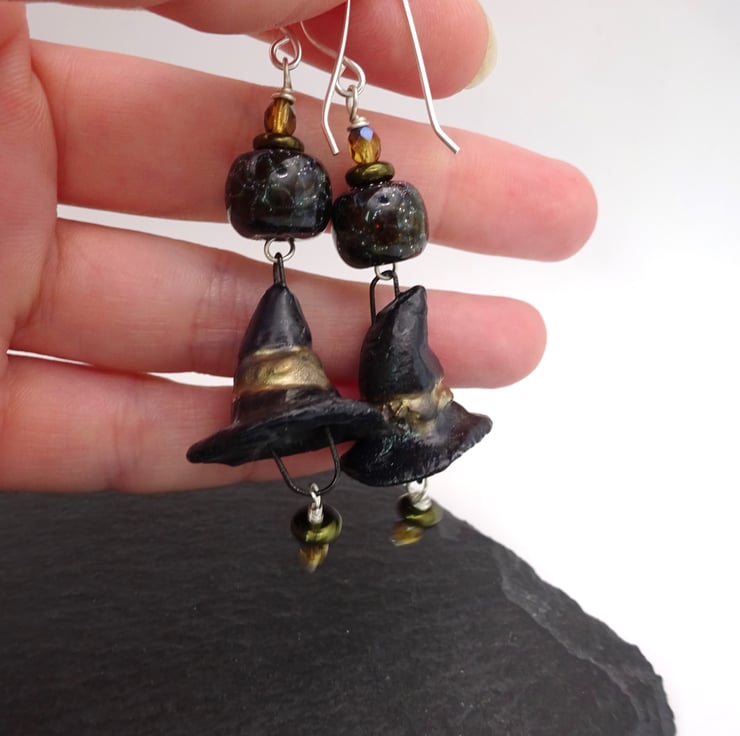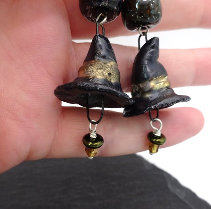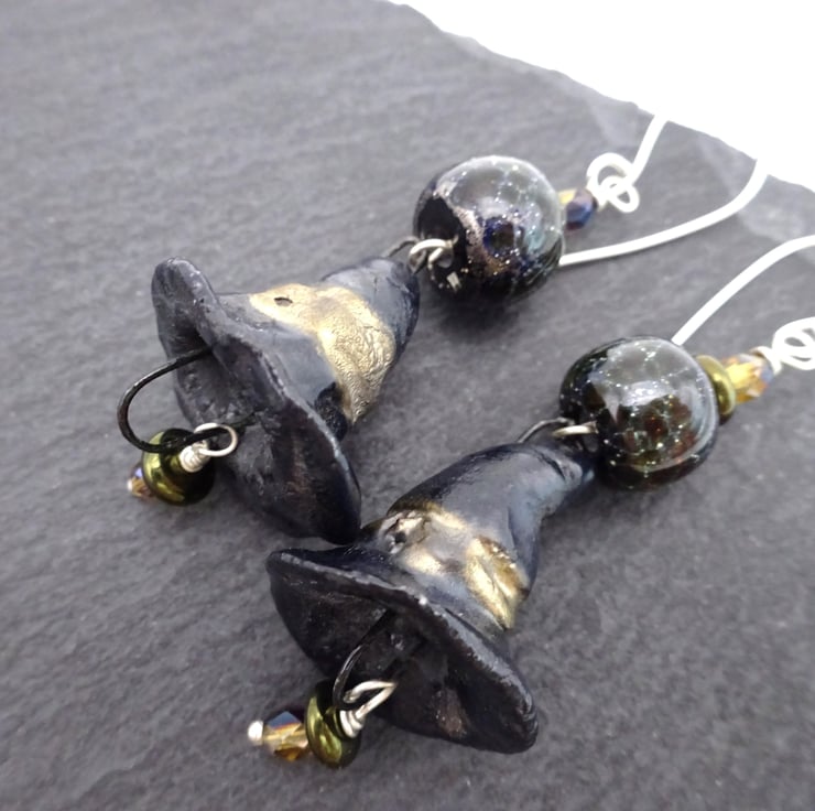 A pair of earrings made with handmade sterling silver ear wires, handmade lampwork glass beads and handmade ceramic witches hats.