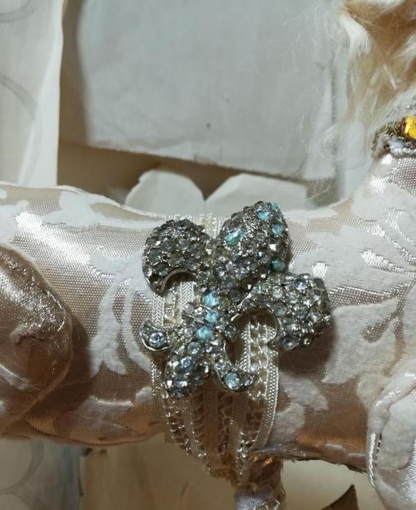 Vintage trim winds around the body and down the base, she is topped with more glitters and embellishments.