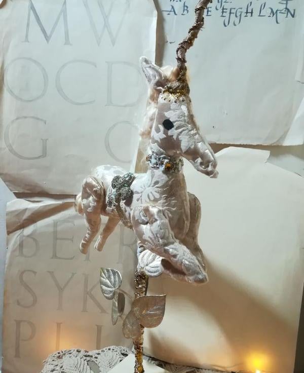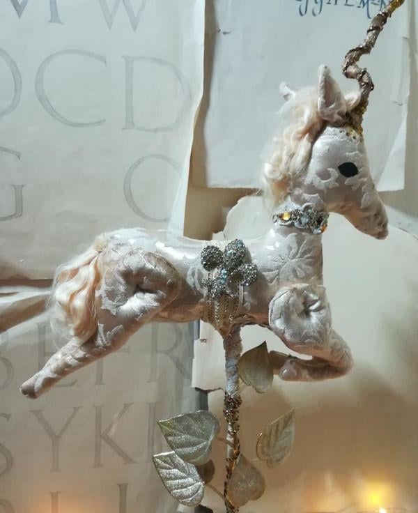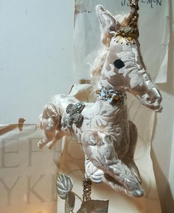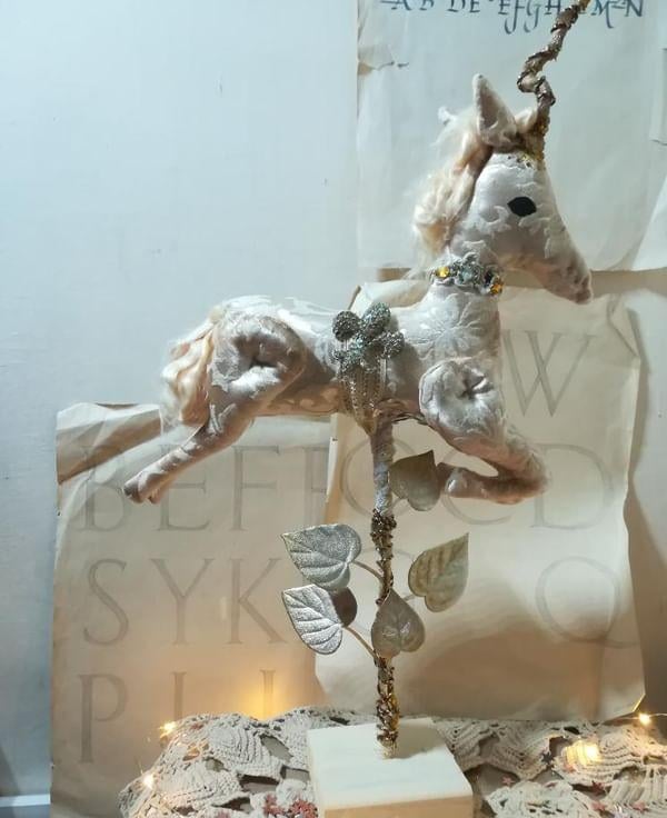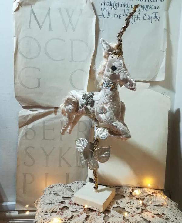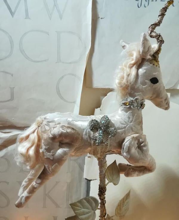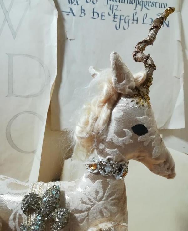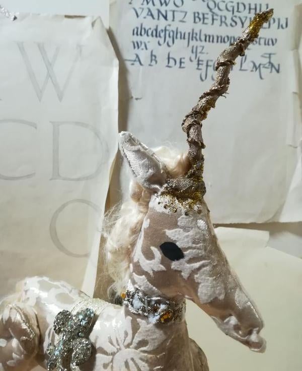 A one of a kind textile art unicorn sculpture.