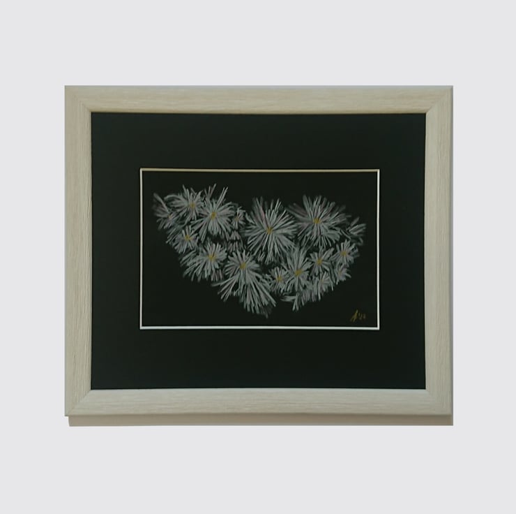 Drawn from my blurred photo of a bunch of Chrysanthemums. i just sketched the outline of the flowers which were in a vase, although I left the vase out of the drawing. I then made up the rest of the pencil drawing using imagination. I made the final original art using white pink & yellow pencils on 280 gsm Somerset black paper.