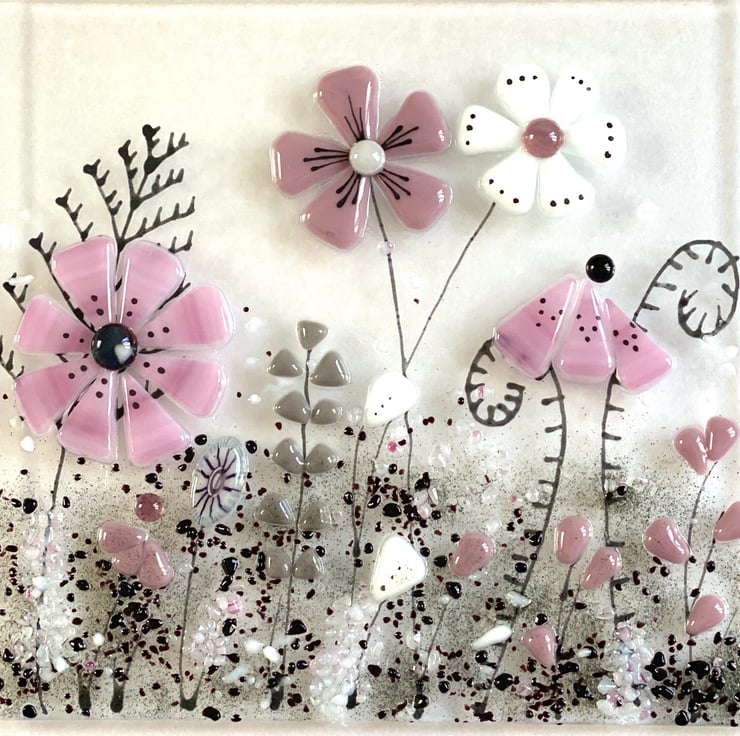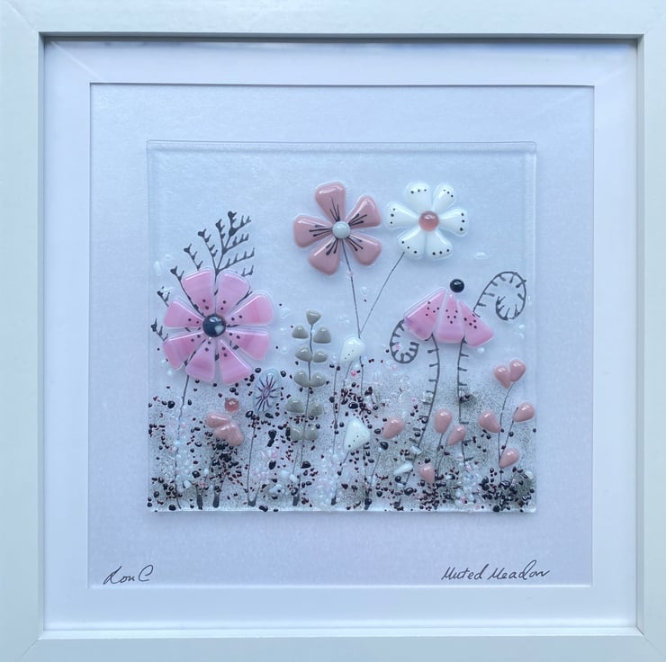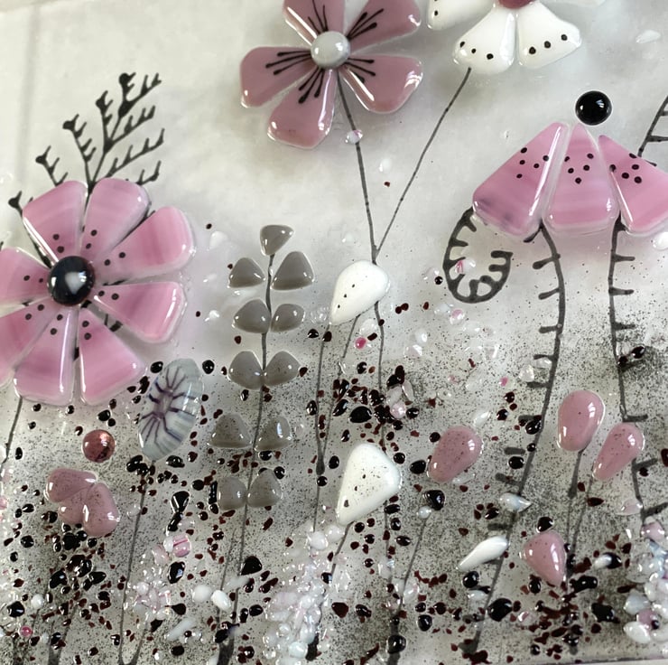 Beautiful shades of pink , mauve and grey glass are cut and shaped to form this intricate meadows design . The fused glass is then kiln fired over two firings before being framed in the 25cm white frame .