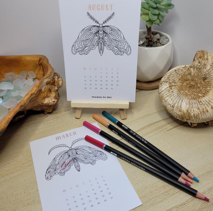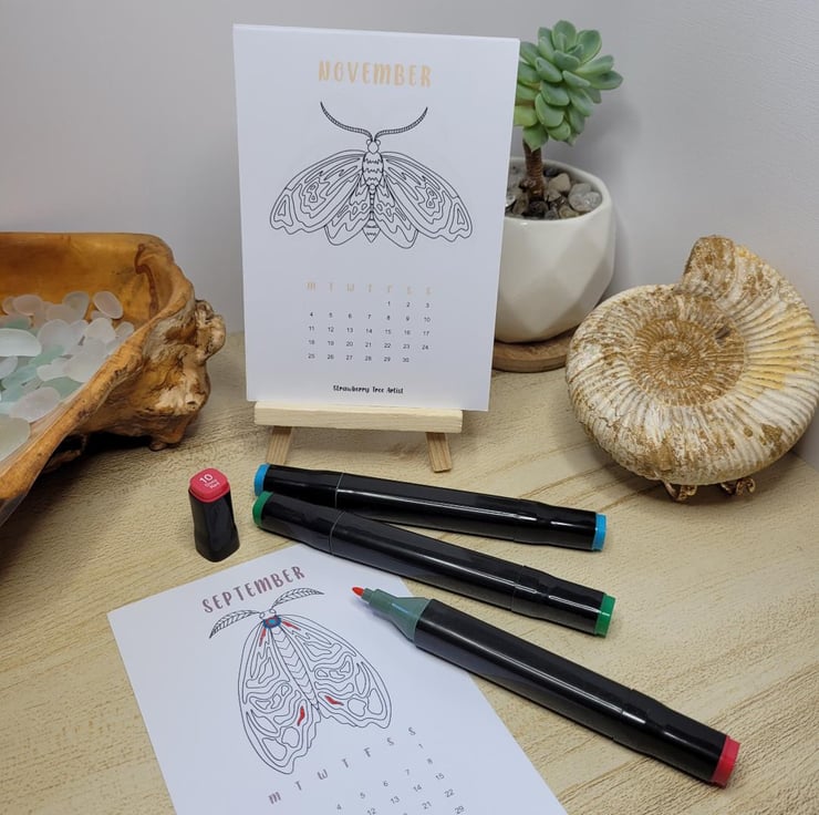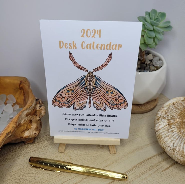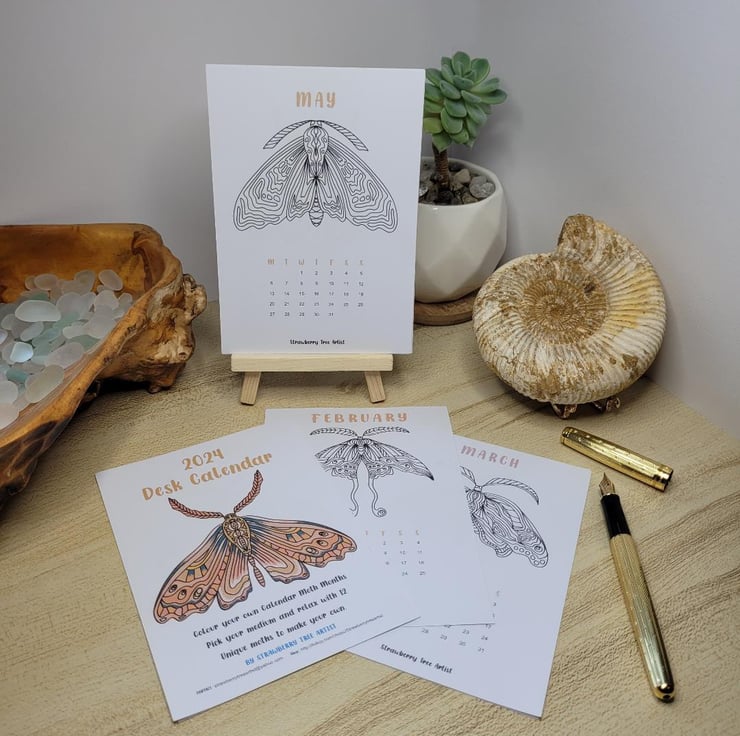 A beautiful A5 2024 Desk Calendar that will neatly sit on your work desk or around the home. It comes with 12 hand drawn Moth designs that you can sit and de stress using this relaxing technique of colouring each of the Moth designs. Each month has a new design for you to take time over and colour as you wish. Grab a drink and take a short break away from everything to just colour.