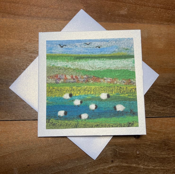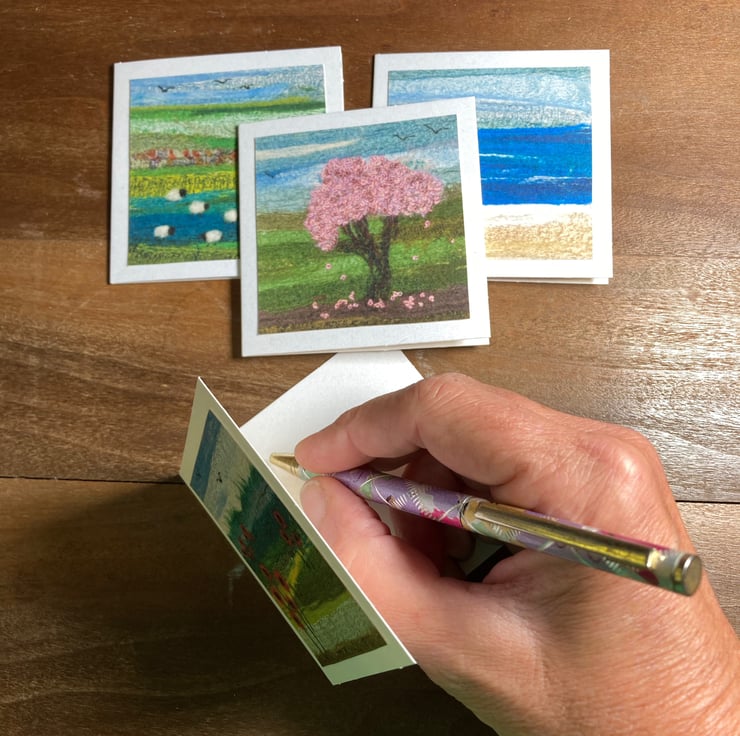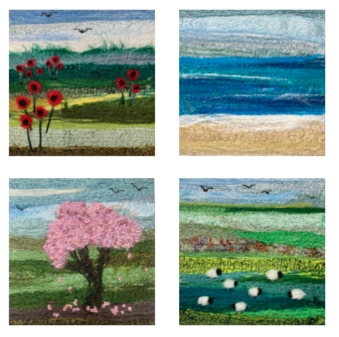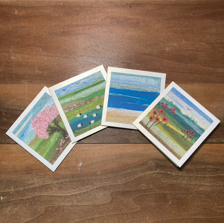 This pack of 4 notelet cards feature images of my original needle felted silk and wool textile art. There are 4 cards, with accompanying envelopes, in a pack, each with a different image. These are small cards measuring 7.5 x 7.5 cm (3" x 3"). They are blank inside, ideal for quick messages, thank you or thinking of you, or invitation responses.