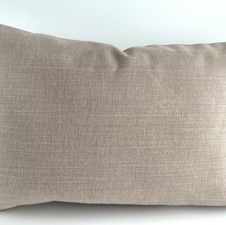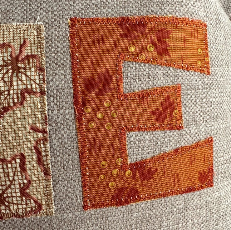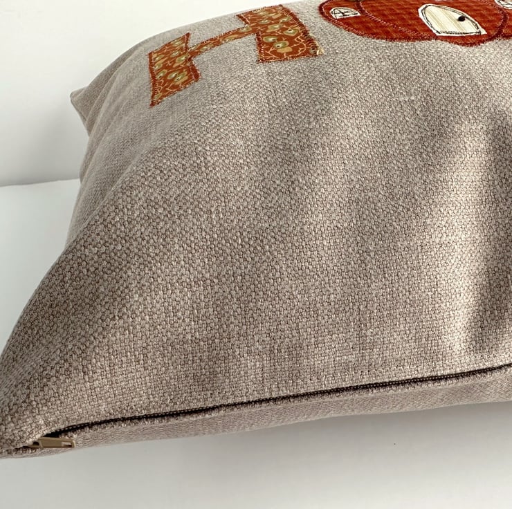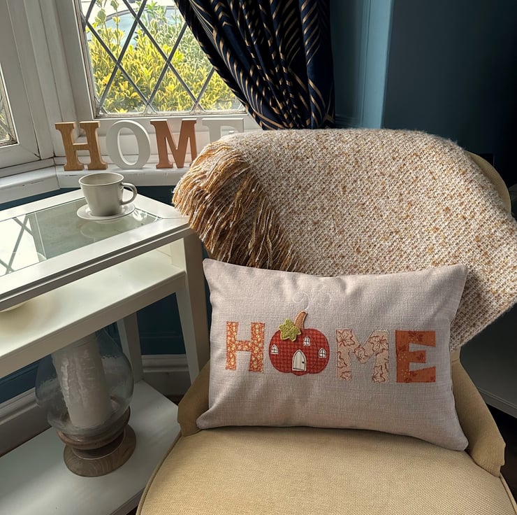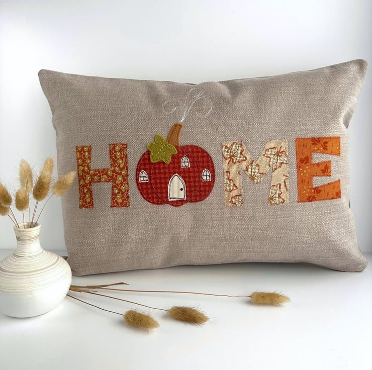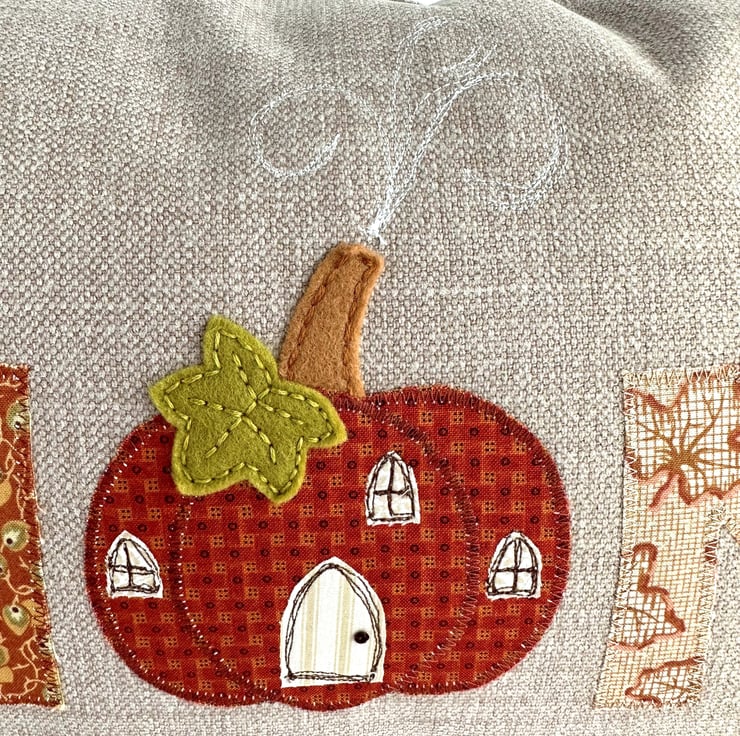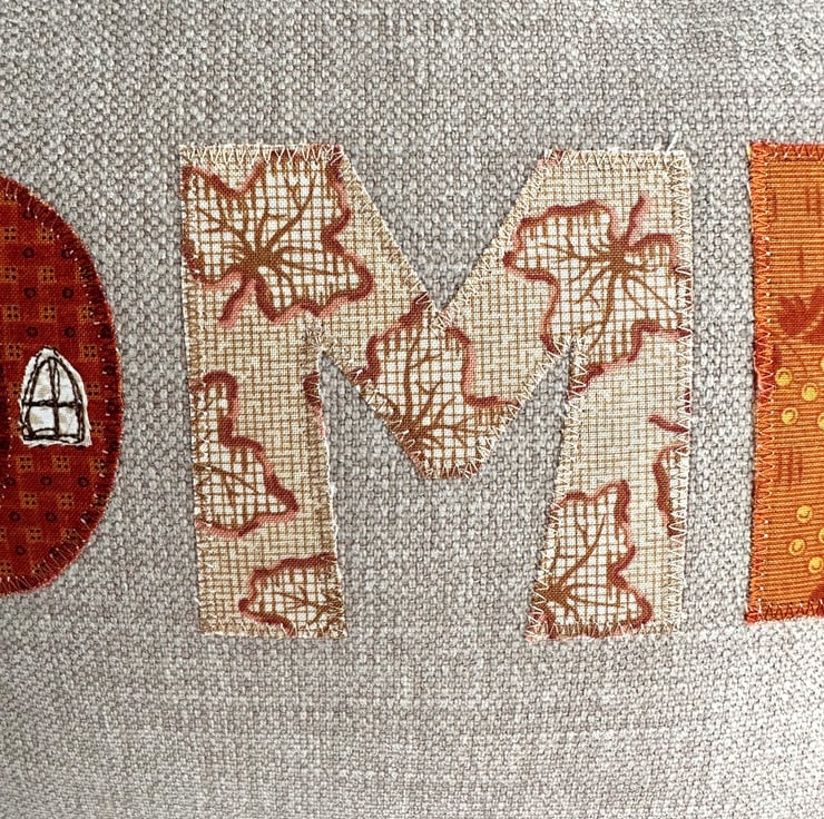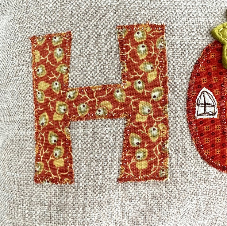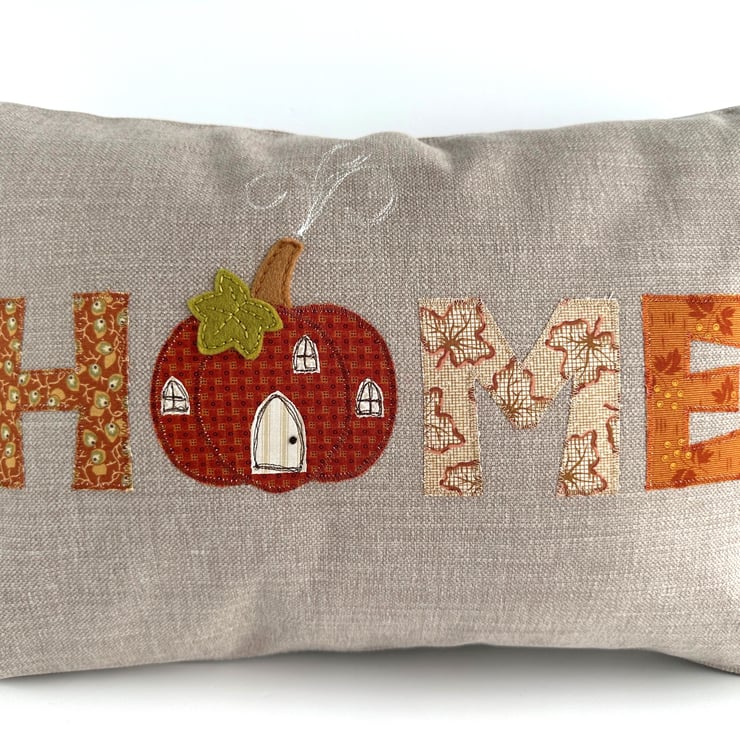 Pumpkin house cushion. A lovely rectangular cushion in taupe fabric with appliqué letters and a pumpkin house spelling out the word “HOME”. The letters are made from a co-ordinating range of autumnal print fabrics in lovely shades of terracotta, burnt orange, beige, cream, ochre and yellow-green. The pumpkin house replaces the “O” in “HOME”. The arch-shaped door and three windows are made from cream and beige striped and leafy fabrics, and I've added free-motion embroidered detailing. The door handle is a hand-embroidered French knot. The pumpkin house has a brown felt stem chimney, and a yellow-green hand-cut felt leaf. Both are hand-embroidered in place. White free-motion embroidered smoke curls into the sky from the chimney stem. The cushion cover has a concealed zip along the bottom and comes with a polyester hollow fibre cushion pad which conforms to safety regulations.