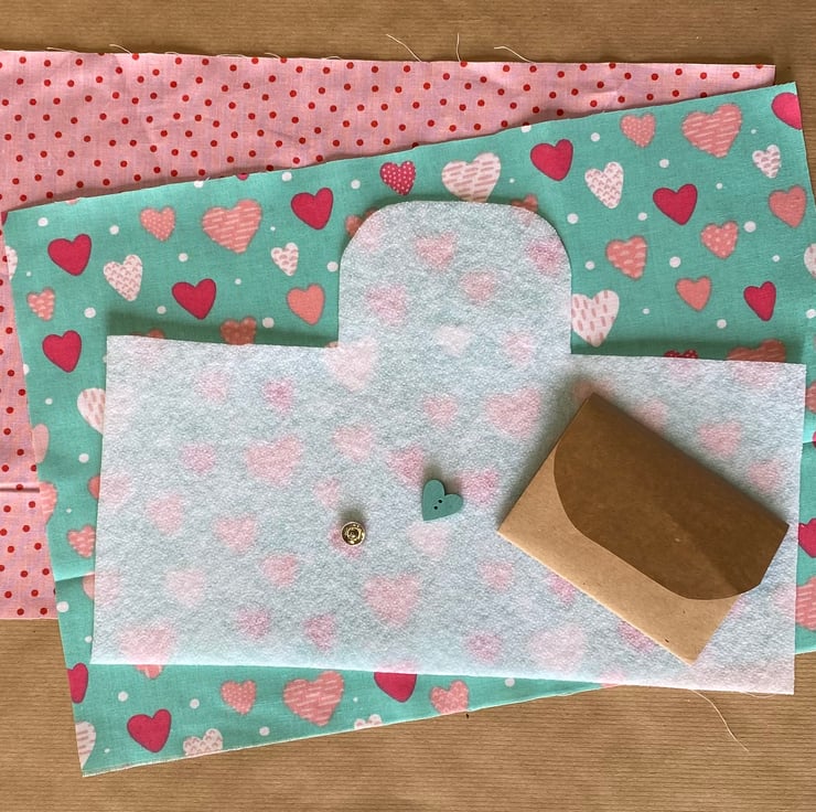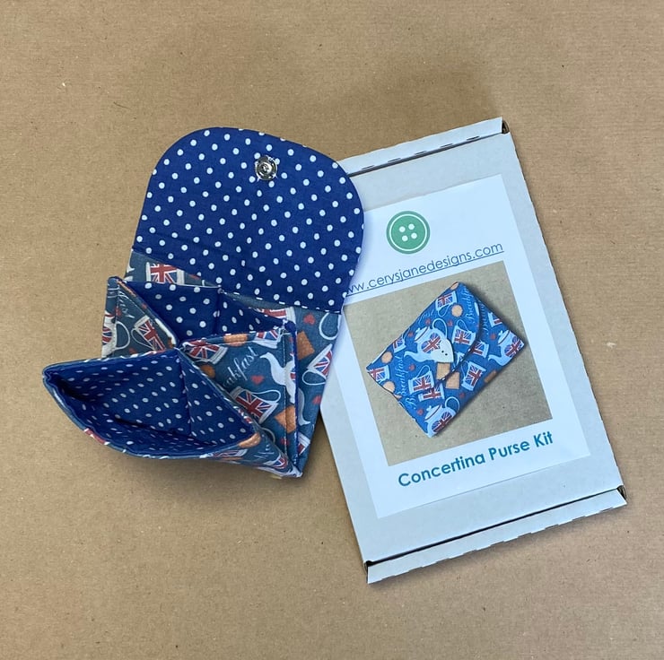 Kit includes 1 piece fusible fleece, 1 piece outer fabric, 1 piece lining fabric - please choose a pattern option, 1 popper and 1 wooden button. The kit has easy to follow instructions and a folded paper purse template - to explain the origami aspects of this purse