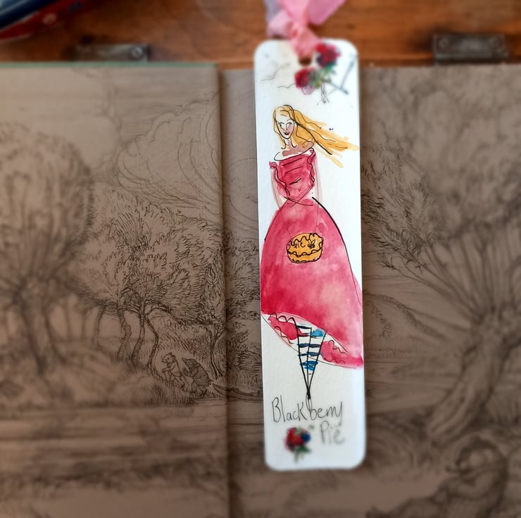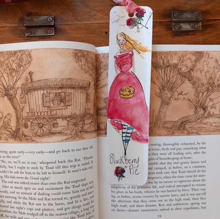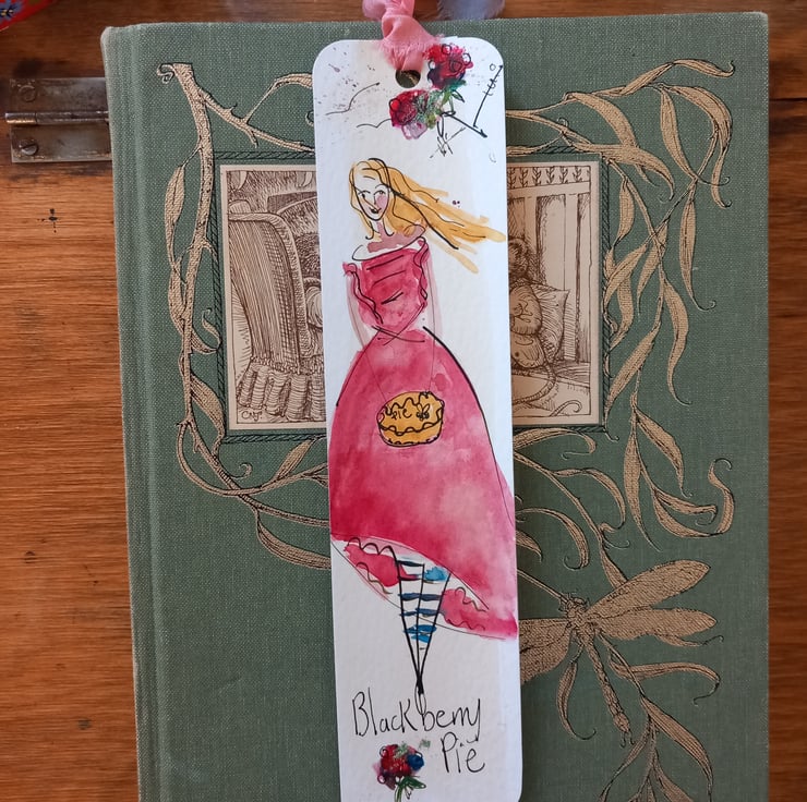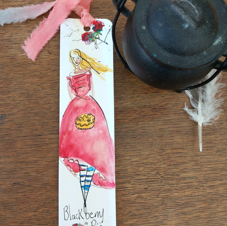 Blackberry pie' Hand drawn and painted bookmark with silk ribbon '