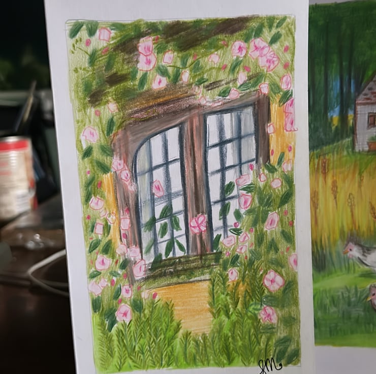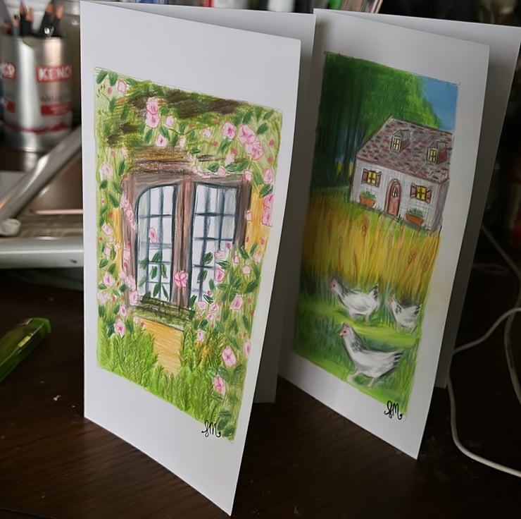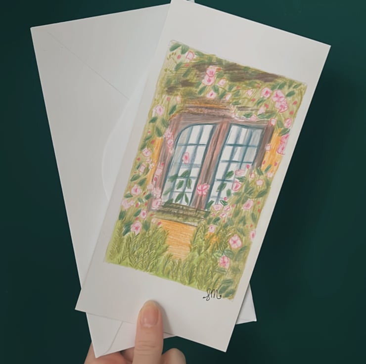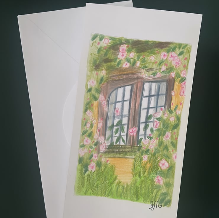 with a cottage window surrounded by flowers, hand drawn directly on to the card by Sophie Massey with Derwent Pro Colour Pencils.