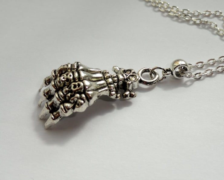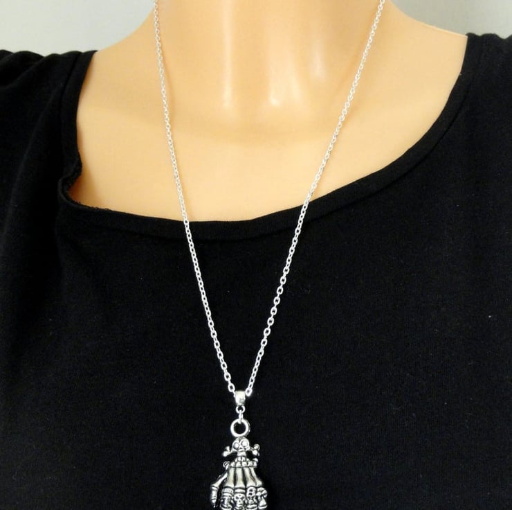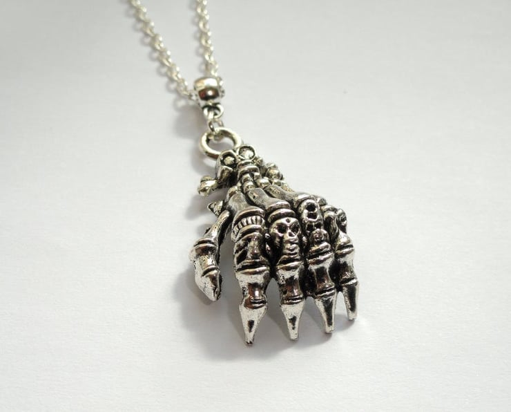 A creepy and beautifully detailed silver plated skeleton hand adorns quality silver plated chain. The necklace closes with a silver plated lobster clasp and is available in various lengths. Please make your selection from the drop down box.
