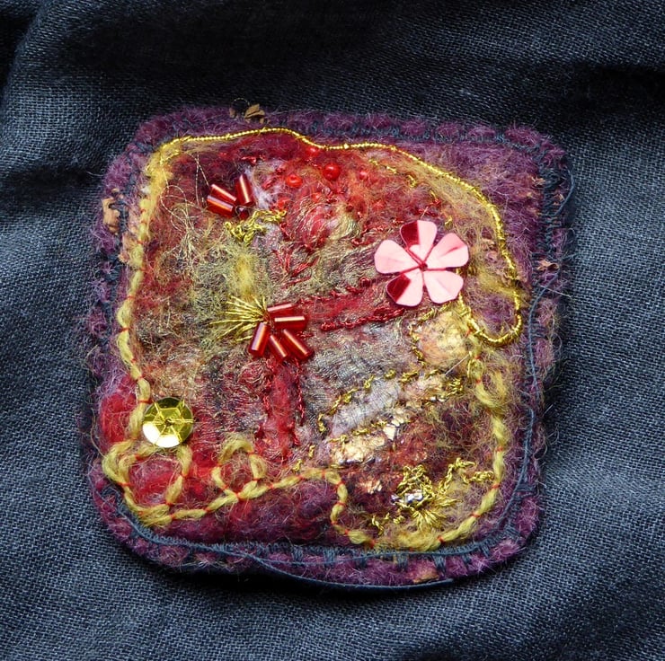 Textile felted shawl and scarf pin. Exciting wool roving colours are needle felted to form a firm base on burgundy felt with an added substantial brooch pin. Edges secured with machine embroidery. Decorated with hand embroidery using a variety of silk and metallic threads also adding stitched beads and sequins to sparkle.