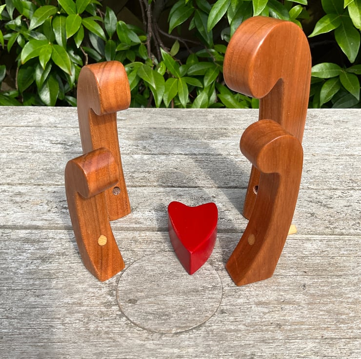 The arrangement is made of cherry wood which has been sanded to provide a very tactile finish free of rough or sharp edges. The natural appearance of cherry wood is further enhanced by multiple coats of drying oil giving a golden brown colouration and a deep satin sheen. The heart is coated with non toxic paint.