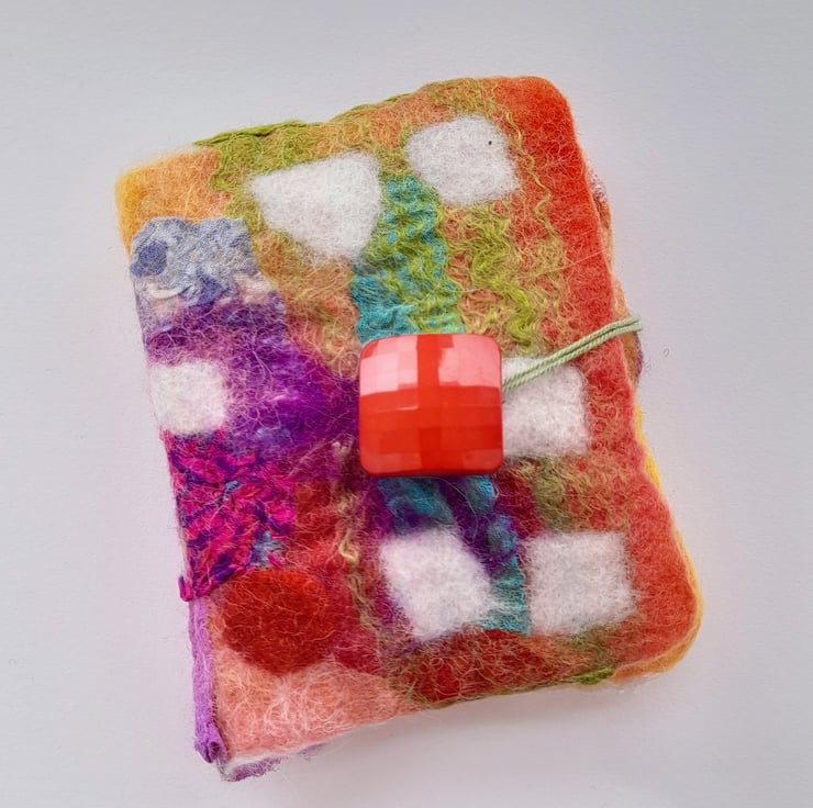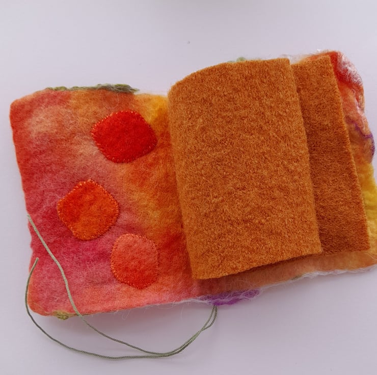 This listing is for one medium book and is empty for you to put your own needles and,or pins in . It is made from the Nuno Felting technique with applique and vintage button and has felted wool inserts