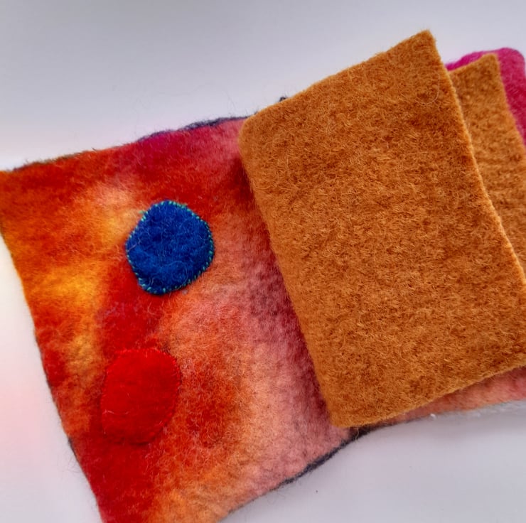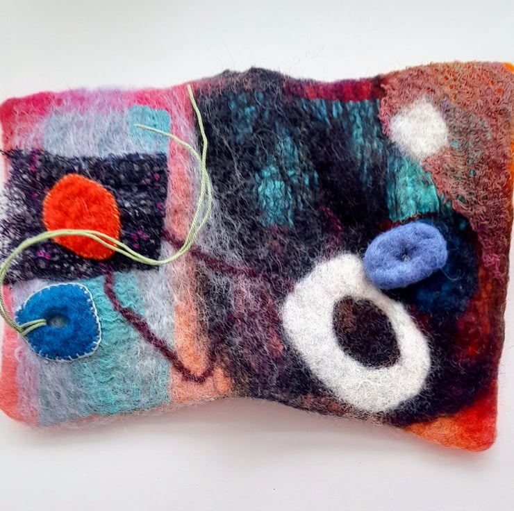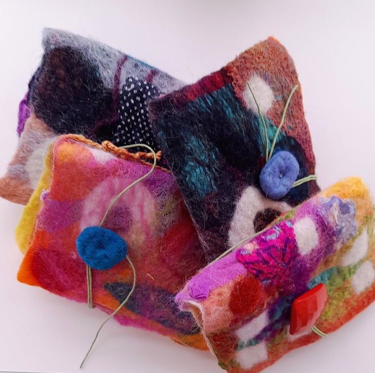 I have always loved working with felt and in recent years Nuno felting which includes silks and other textiles that can be felted into the wool I sometime like to combine applique. I recently made myself something to keep my pins handy in and thought Id make some more.