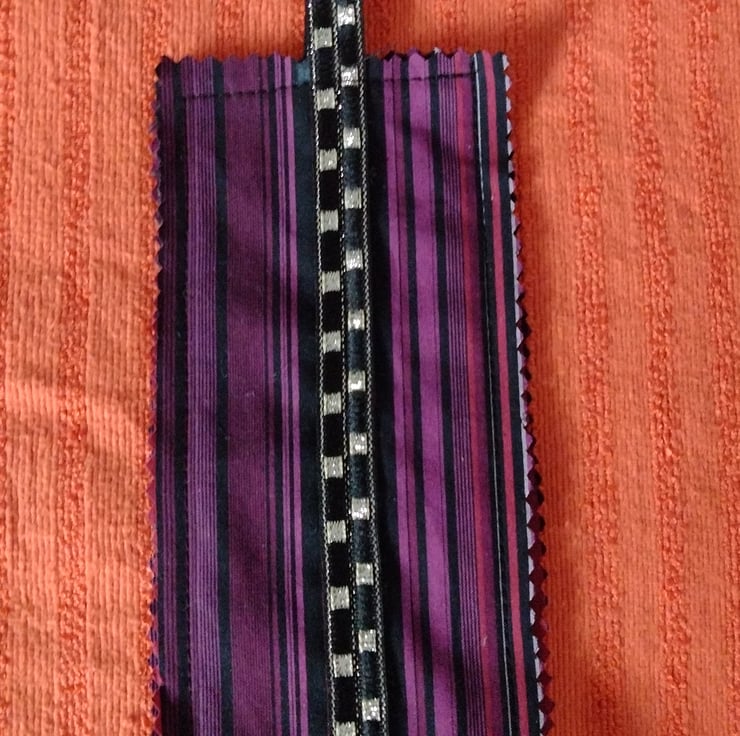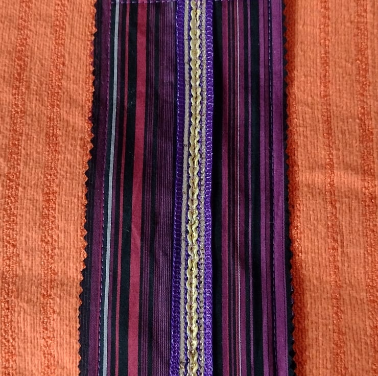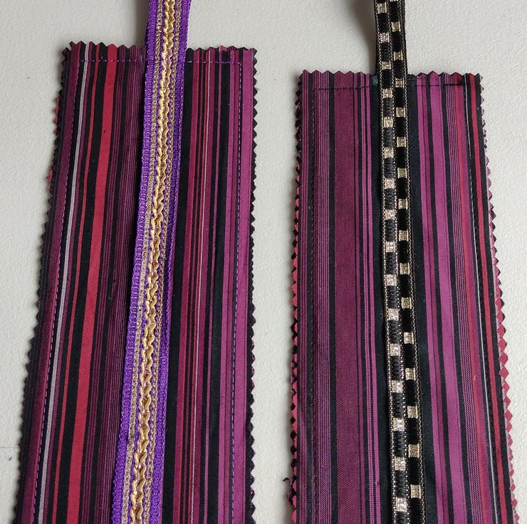 This has been made using upcycled cotton fabrics and some trim. There are two to choose from, one with purple and gold trim and one with black and silver trim please indicate when ordering which you prefer